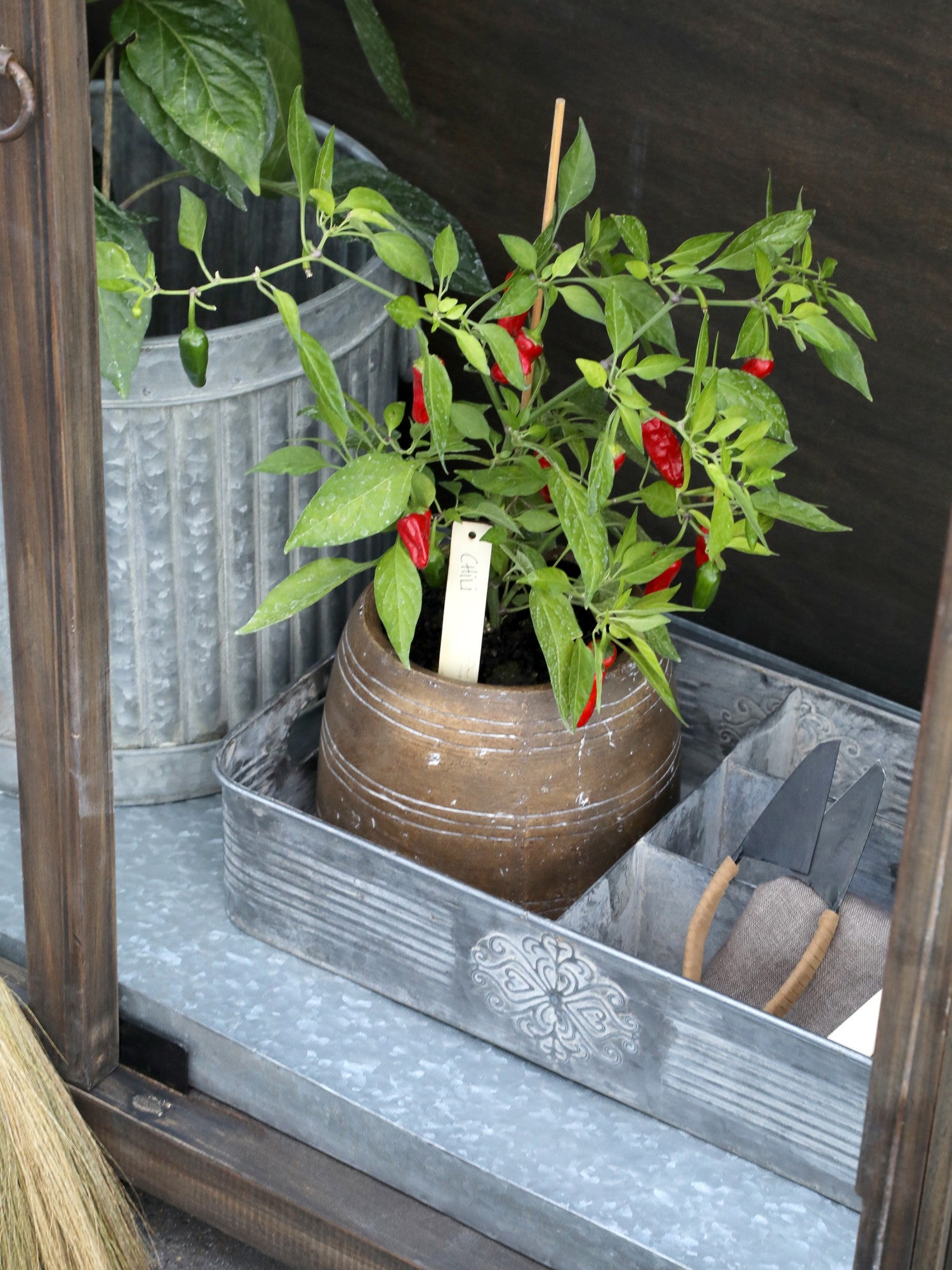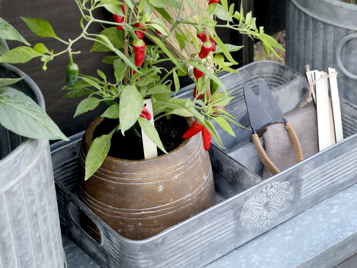 Smuk og pratisk bakke i metal i zink look med lidt rust. Bakken er opdelt med fire rum, et stort og 3 små. På siden har bakken et fint motiv præget ind i bakken. Bakken har håndtag så den er nem at tage med rundt. Bakken kan bruges både inde og ude til opbevaring af eks. dine små have redskaber, frøposer osv, eller inde på kontoret til dine småting som blokken eller kuglepinden.