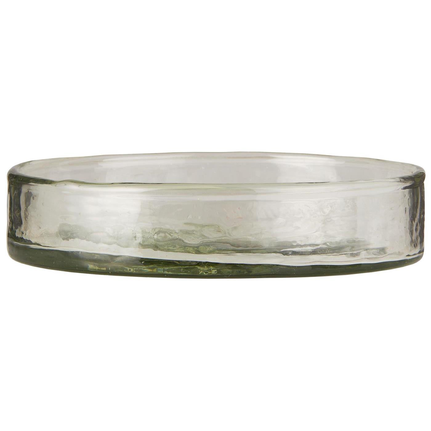 Fin rund bakke i mundblæst klar glas fra Ib Laursen. Bakken har en lille kant. Bakken er fin til bloklys, eller brug den som underskål til en potteplante eller til opbevaring på badeværelset til smykker, og andet.
