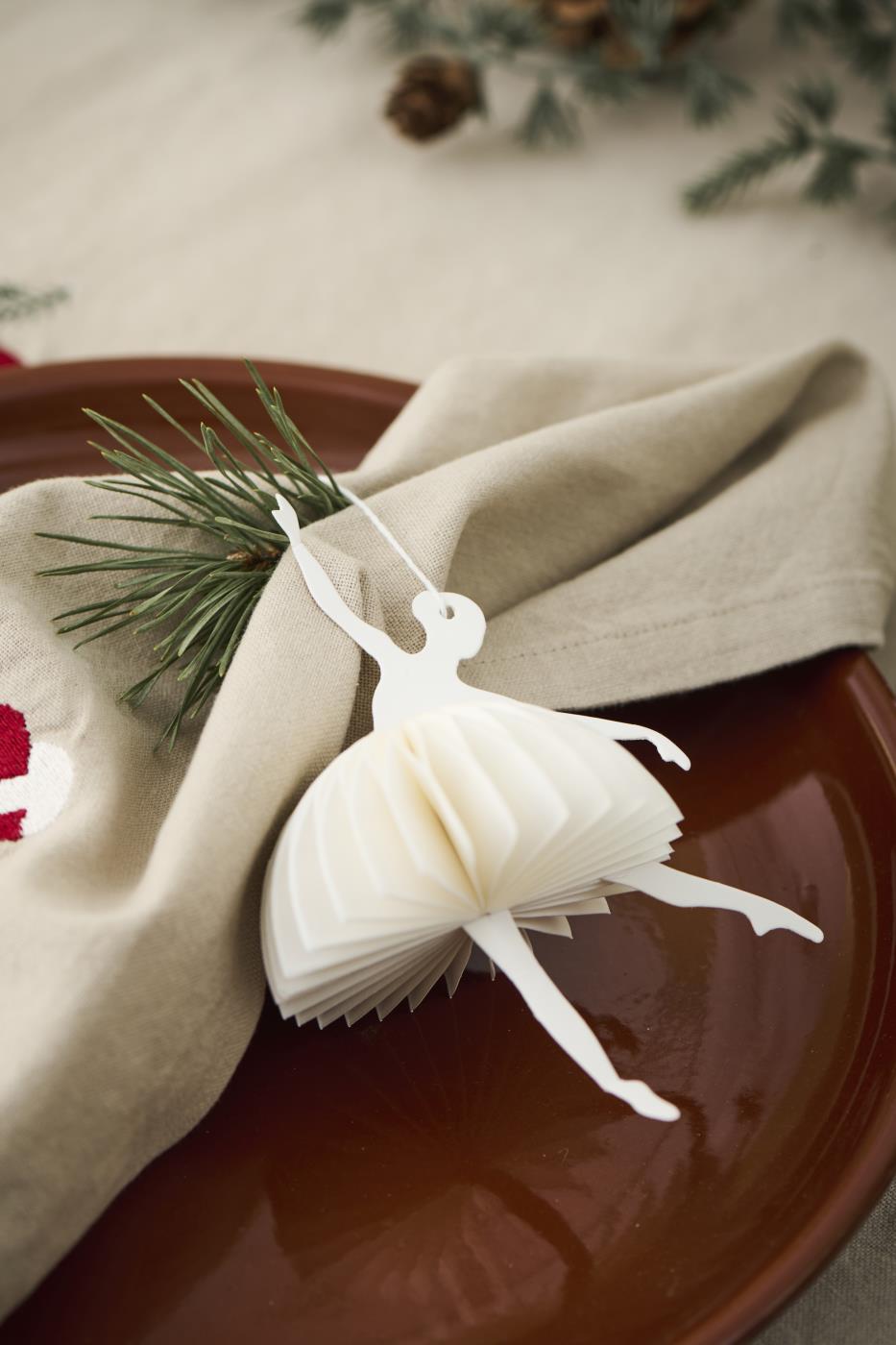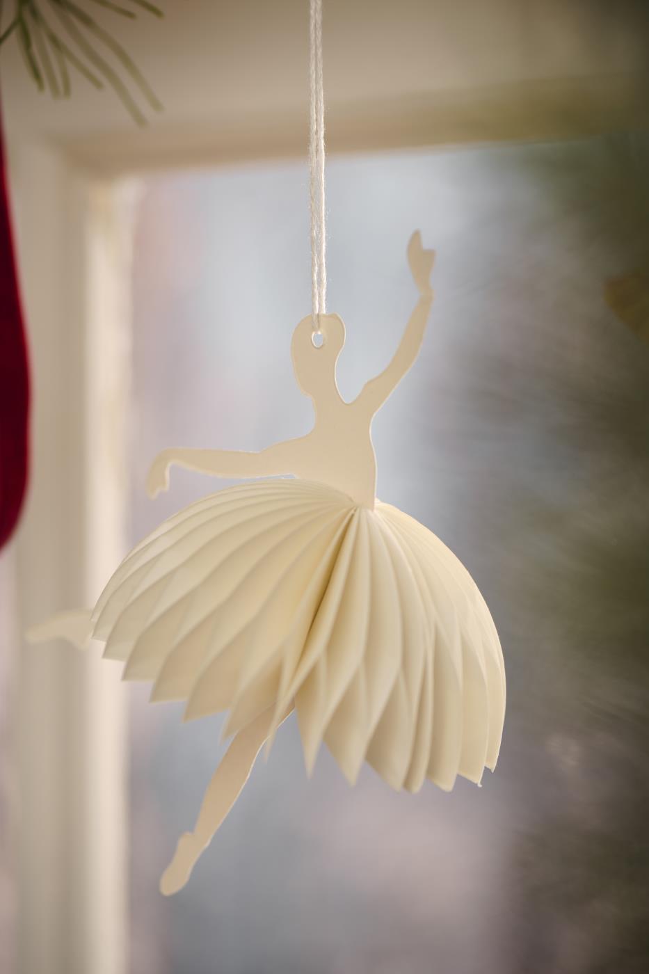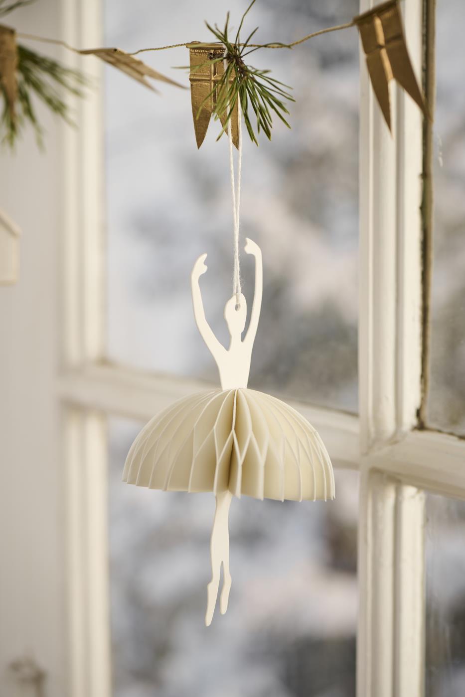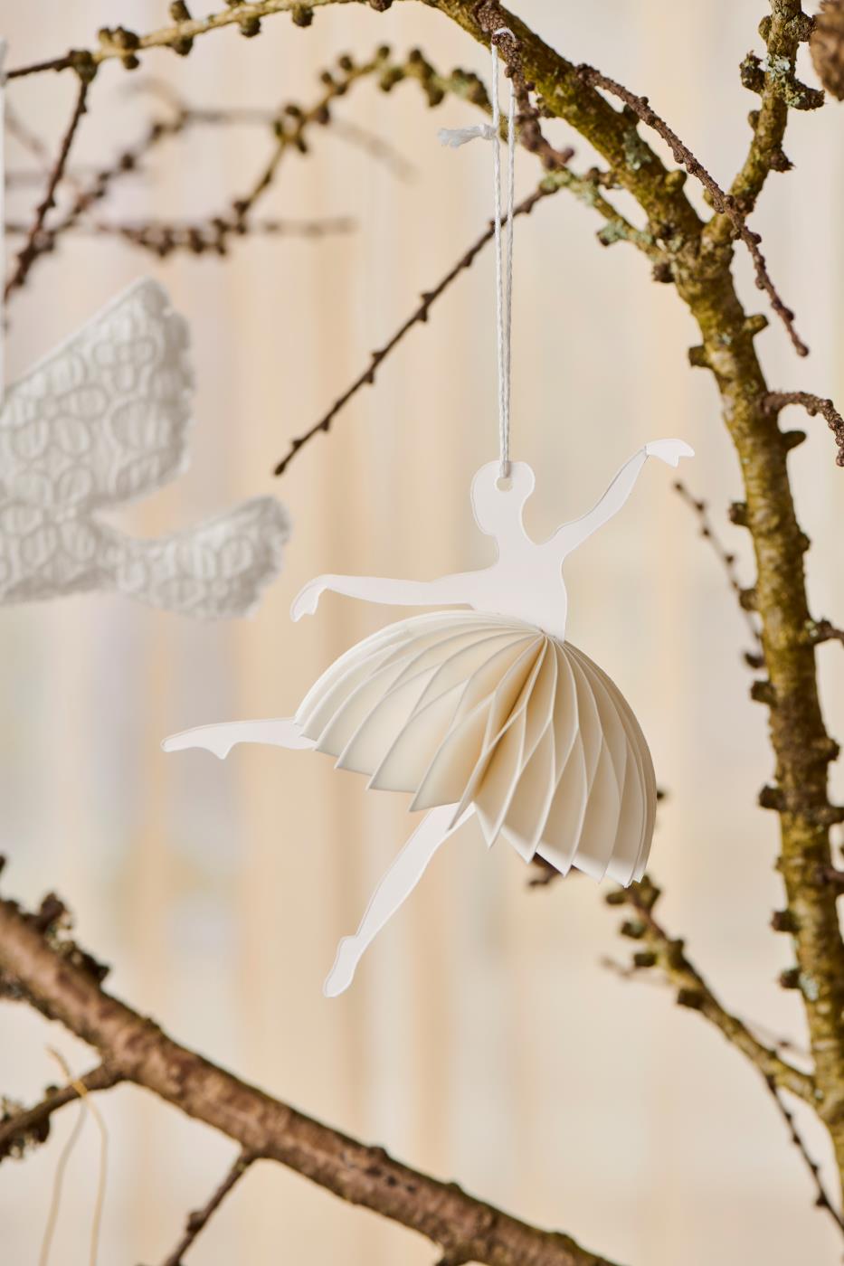 Ballerina lavet i papirklip i hvid karton med skørt i papir fra Ib Laursen. Ballerinaen er til ophæng på et juletræ, i vinduet eller på en gren. Ballerinaen finder to forskellige varianter og positioner. Releve position eller danse position. Ballerinaen har magnet så skørtet let kan foldes ud ved brug, og foldes sammen igen når den skal pakkes ned igen. Der er snor til ophæng.