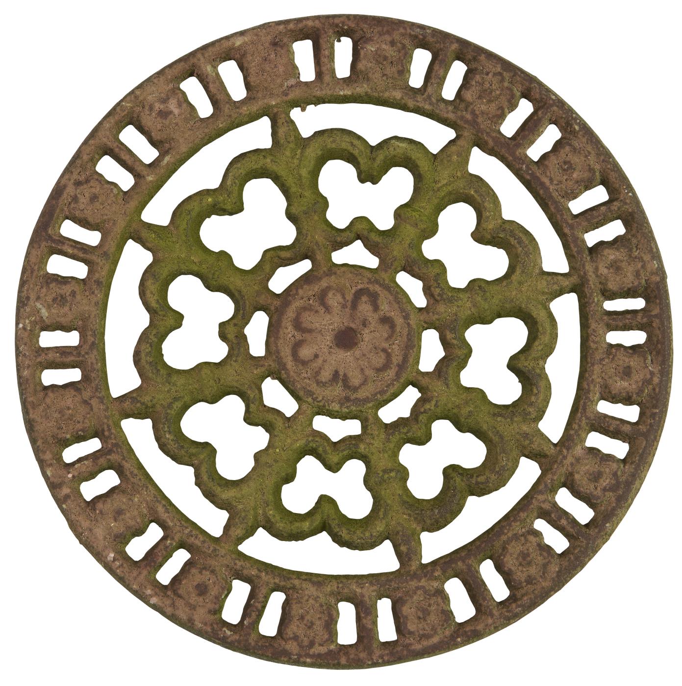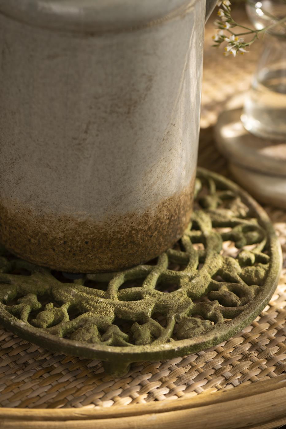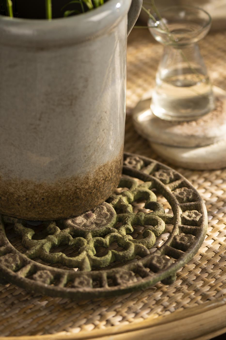 Rund bordskåner i jern med mønster, i farven brun med mosgrøn. Findes i to varianter.