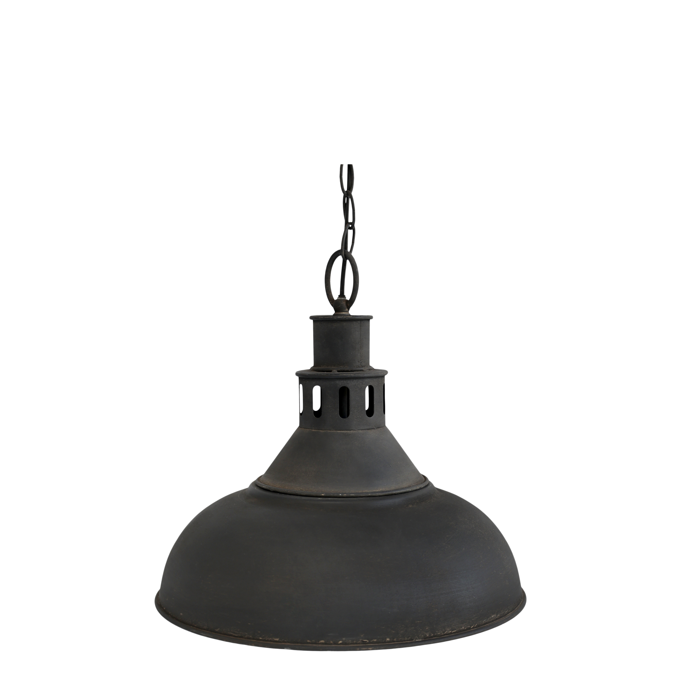 Factory loftlampe I antique sort i metal fra Chic Antique med mange fine detaljer. Loftlampen hænger i kæde og har en fin loftroset. Lampen har et rustikt og gammel look. Der er 1,5 meter ledning på lampen, og bruger pærer E27 med Max. 60 watt. Pærer medfølger ikke.