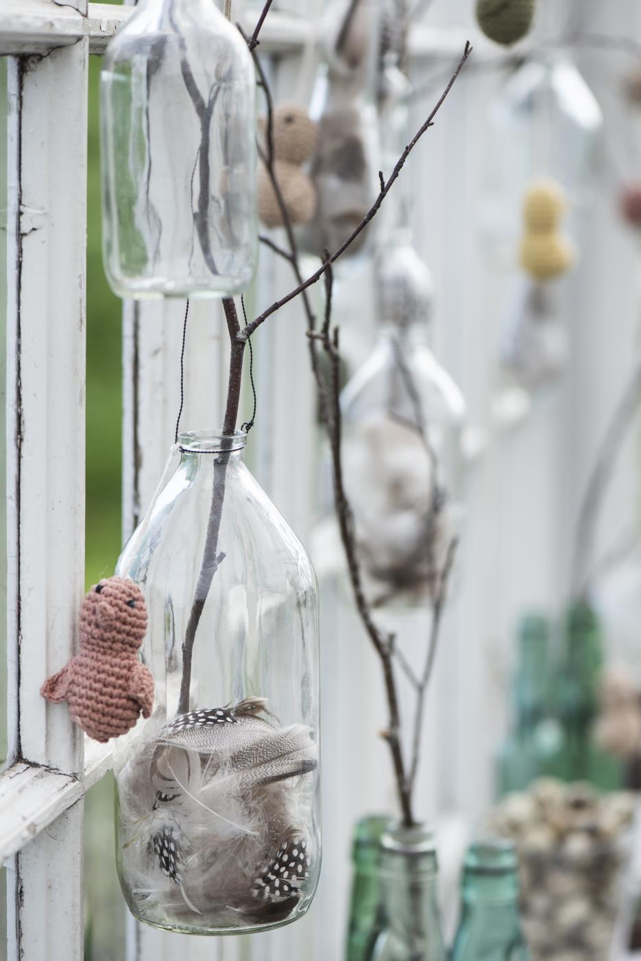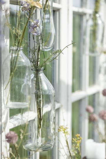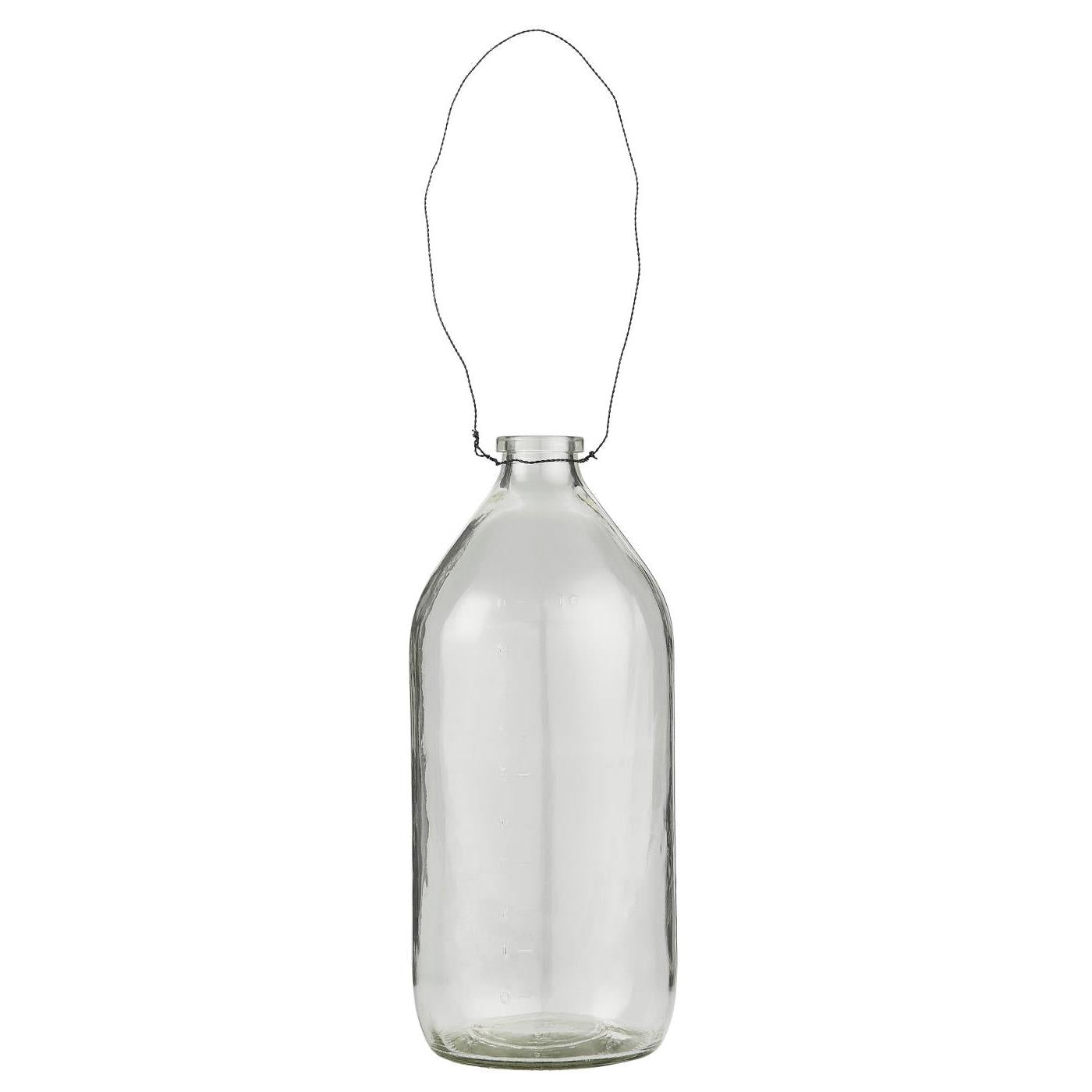 Flasken kan stå selv og hænge i wiren, og fungere som vase eller som flaske til lysholdere.