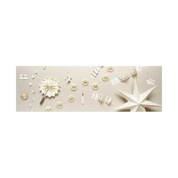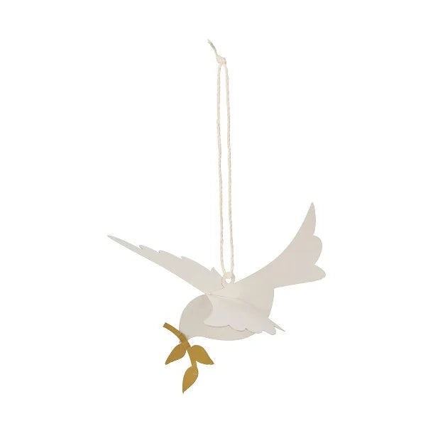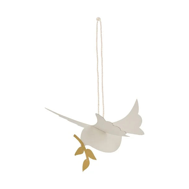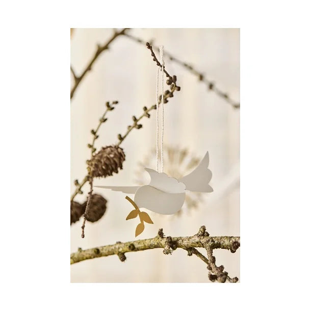 Fin fugl i hvid papirklip med en guld kvist i næbbet. Fuglen er til ophæng, og fra Ib Laursen. Fin som pynt på en gren, i vinduet eller på juletræet.