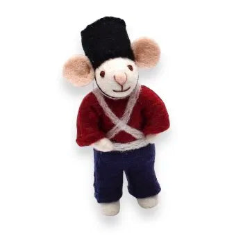 Fin håndfiltet hvid mus med lyserøde ører. Musen har filtet tøj på, med mange fine detaljer. Musen har bøjelige arme og ben, og snor til ophæng. Musen kan stå selv, eller hvis man bøjer benene på den, kan den sidde.