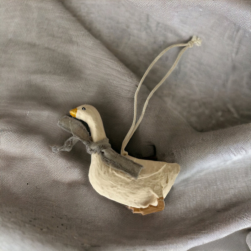Håndlavet og unik gås fra det danske firma OX Handcraft som laver fine ting af genbrugspapir, bomuldsrester og rismel. Gåsen er fin at hænge på en gren, juletræet eller i vinduet, brug den som servietring, eller til bordpynt. Gåsen har snor til ophæng, og et fint tørklæde om halsen. Vælg mellem lyserød eller gråt tørklæde. Fin og unik julegås.