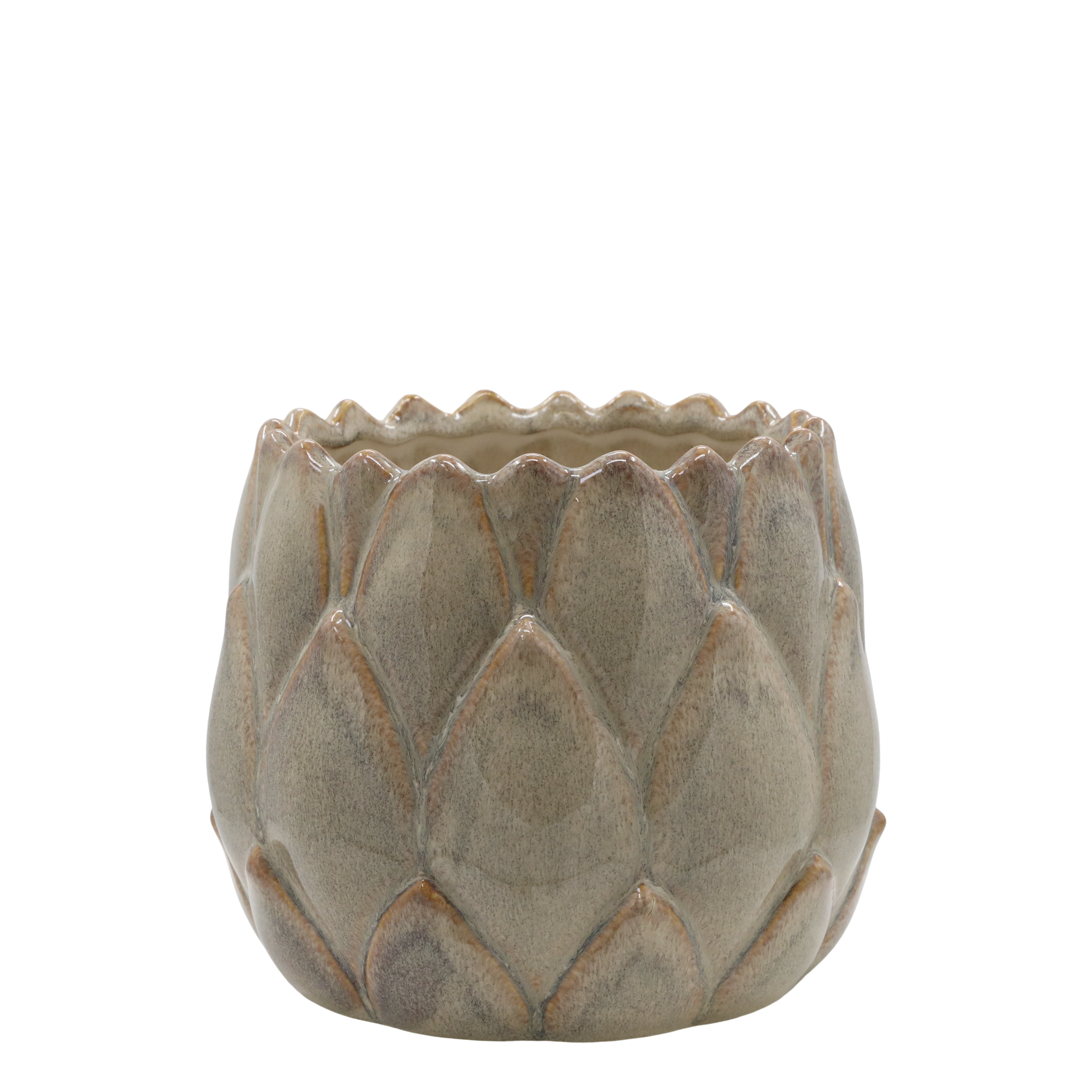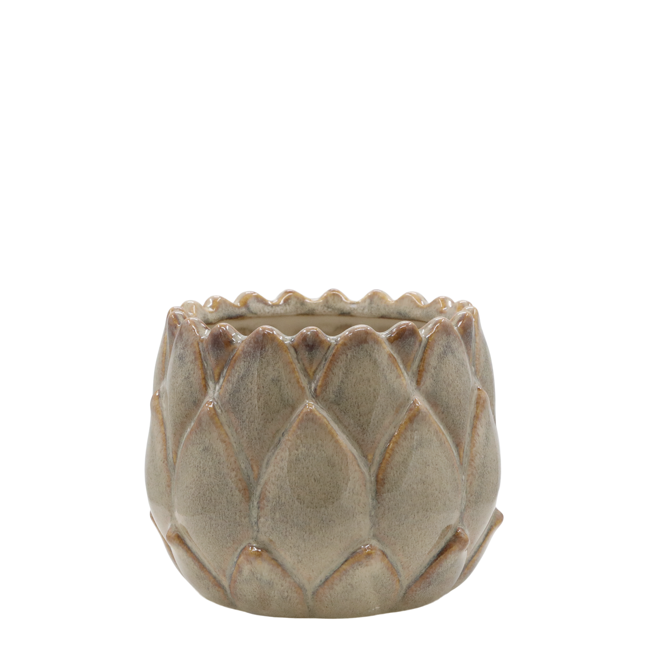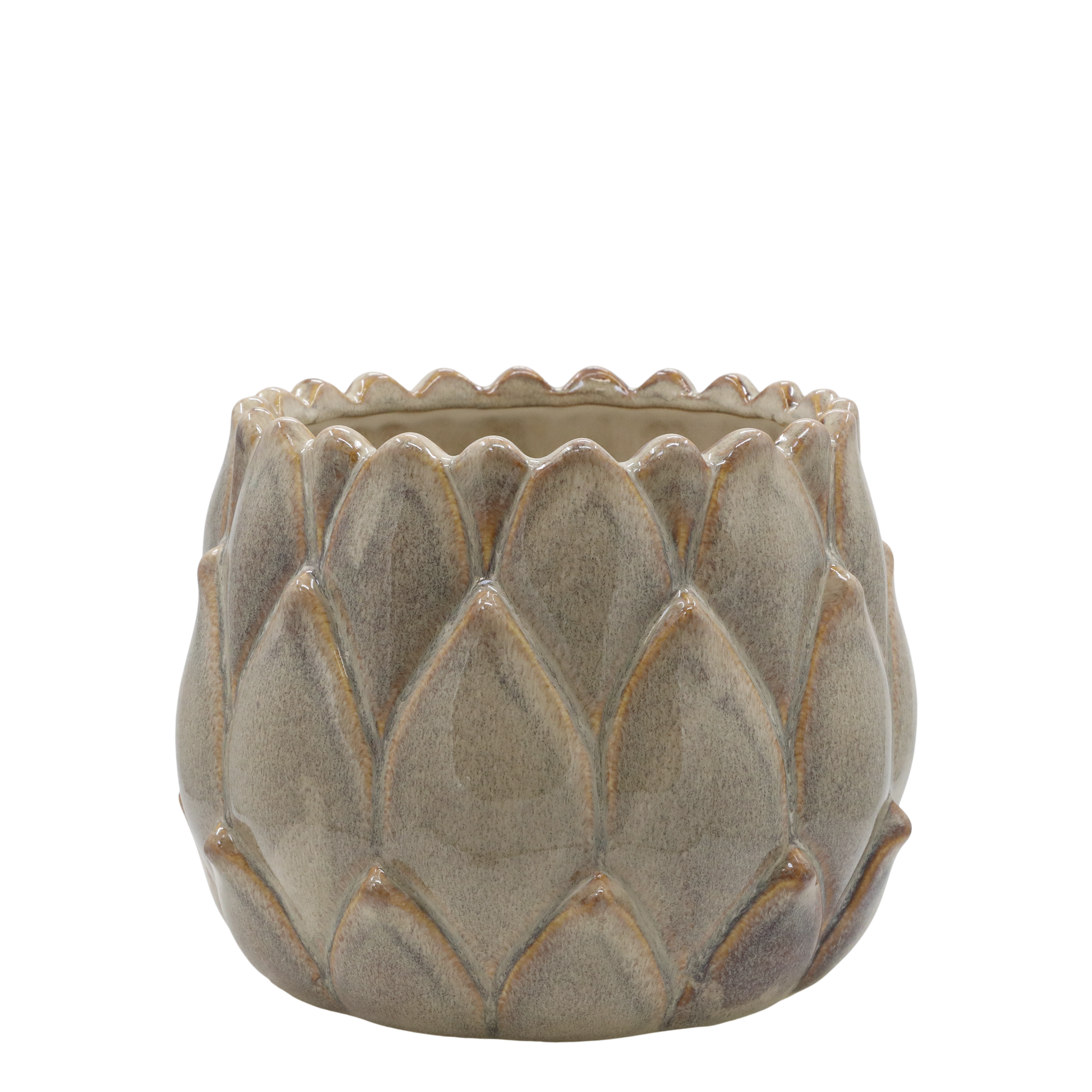 Smuk urtepotteskjuler med finde detaljer fra Chic Antique i Gaston serien. Urtepotteskjuleren er i keramik, den er rund med motiv af store blade, og den er i latte farve. Der kan forekomme variationer i glasur og farve. Findes i tre størrelser.