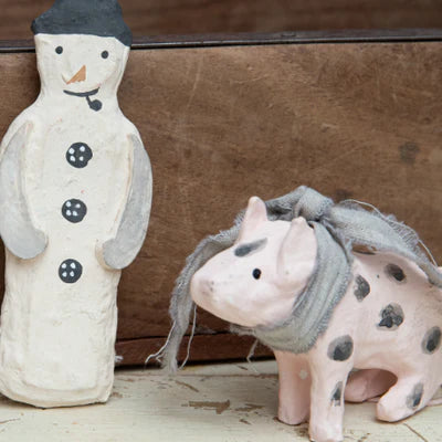 Håndlavet og unik gris med prikker fra det danske firma OX Handcraft som laver fine ting af genbrugspapir, bomuldsrester og rismel. Grisen er fin at hænge på en gren, brug den som servietring, brug den til bordpynt, eller den vil være fin som en anderledes og helt specielt mandelgave måske i stedet for marcipan grisen. Grisen har snor til ophæng, og et fin bånd om halsen.