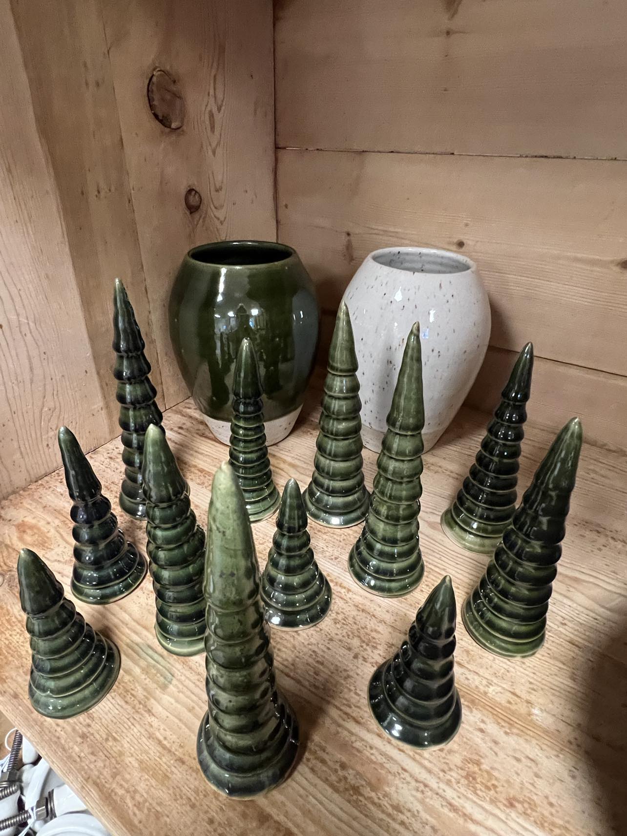Håndlavede keramik juletræer fra Vangs keramiske værksted.