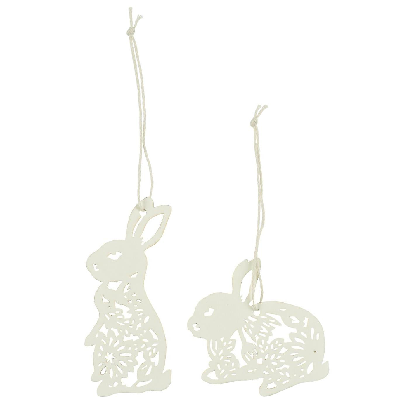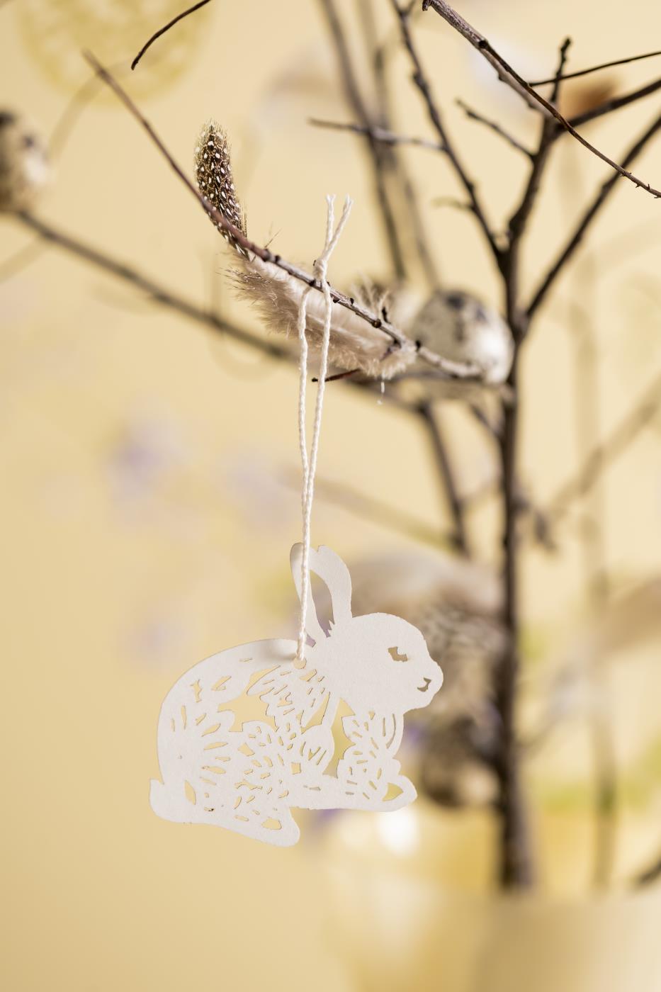 Harer i det fineste hvide papirklip. Papirklip er en fin og elegant måde at få pyntet op til påske. Sæt harerne på en simpel forårsgren i en vase, eller hæng dem i vinduet. Der er to forskellige motiver, og der er én af hver i et sæt.