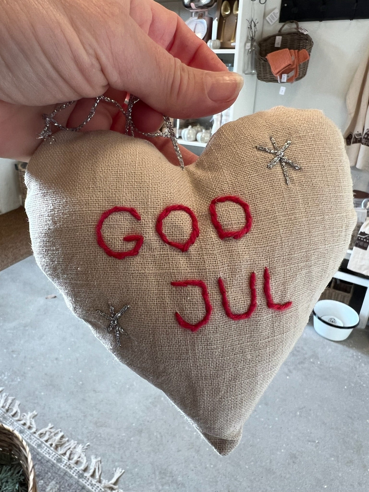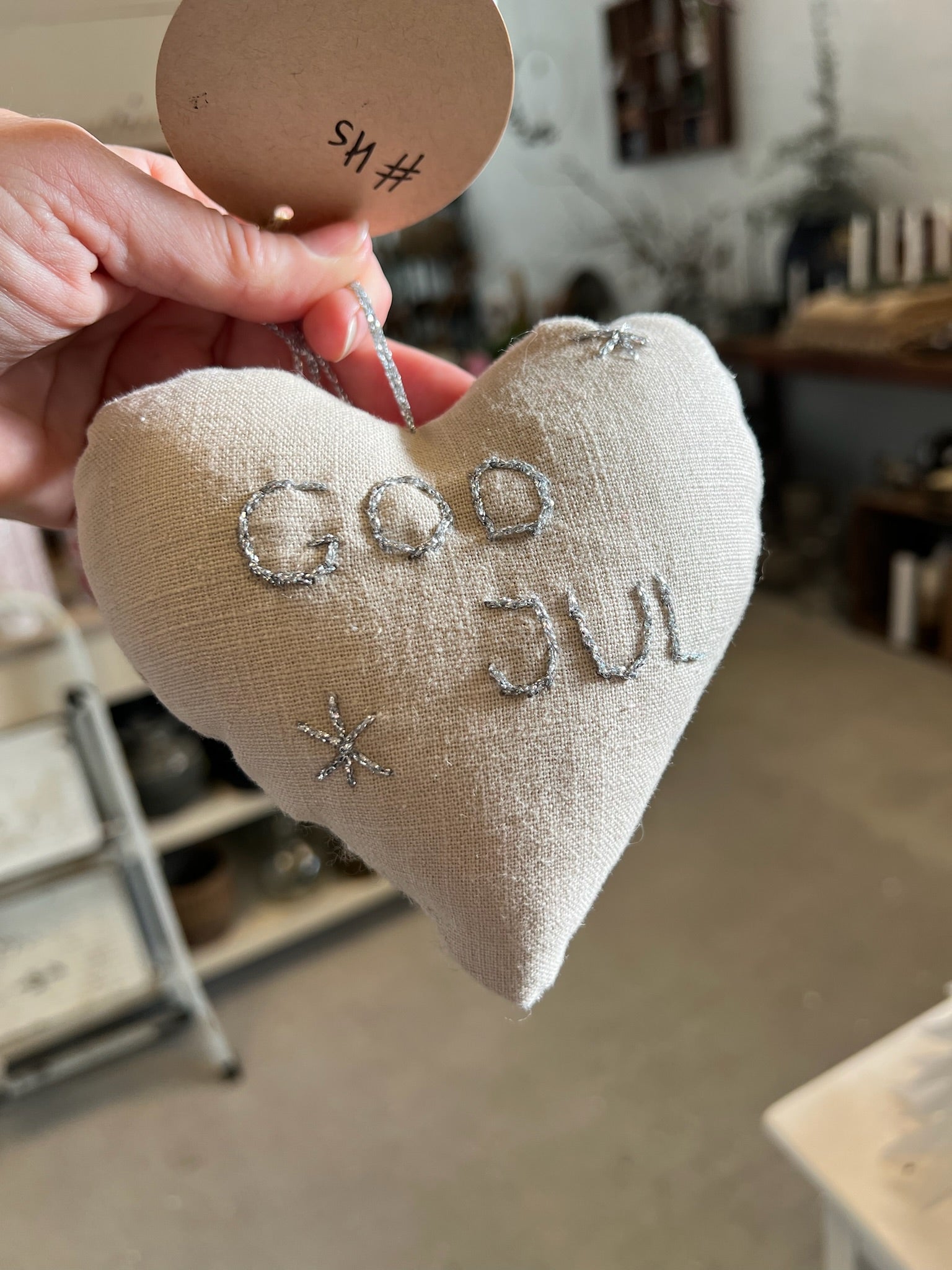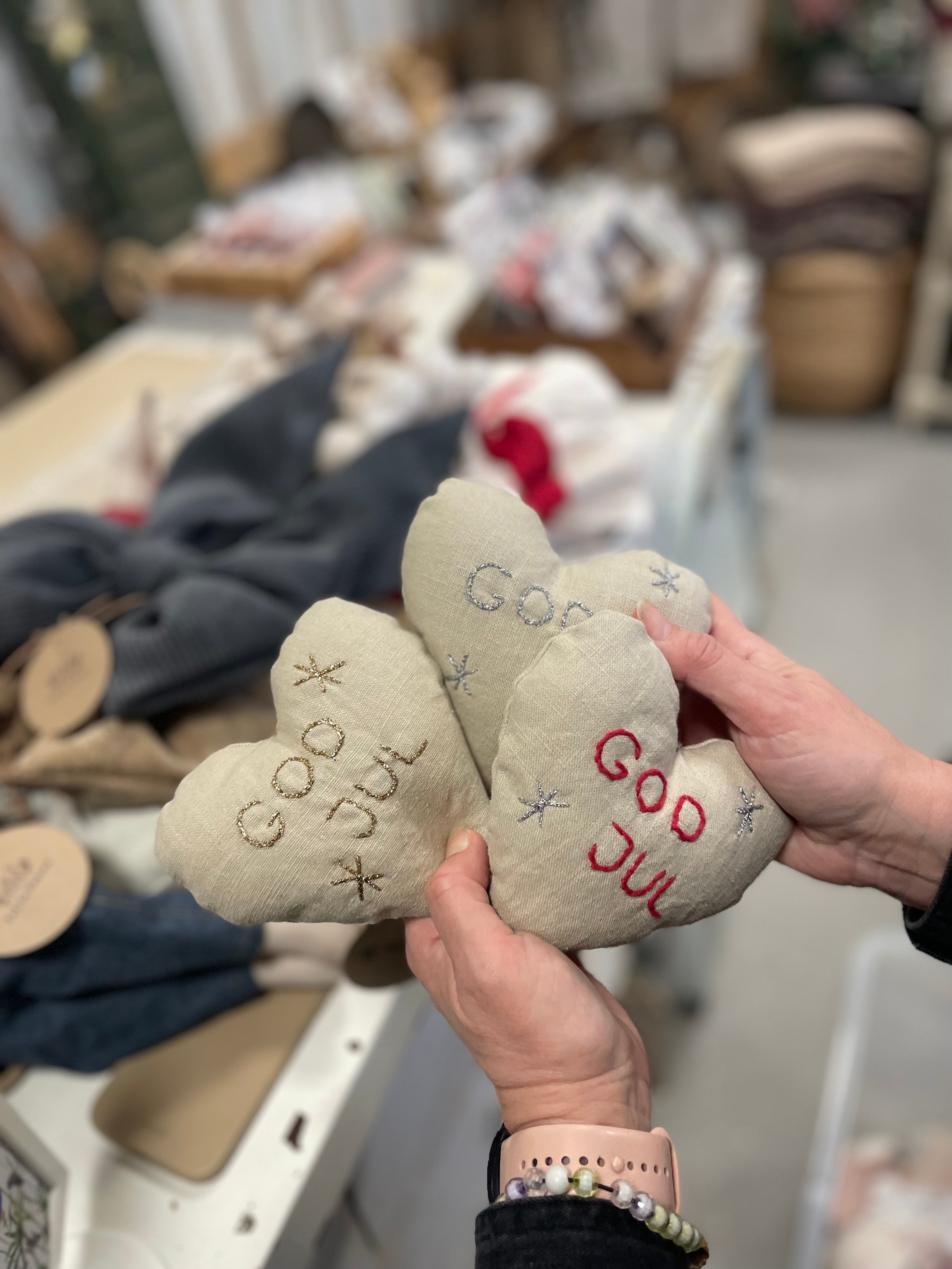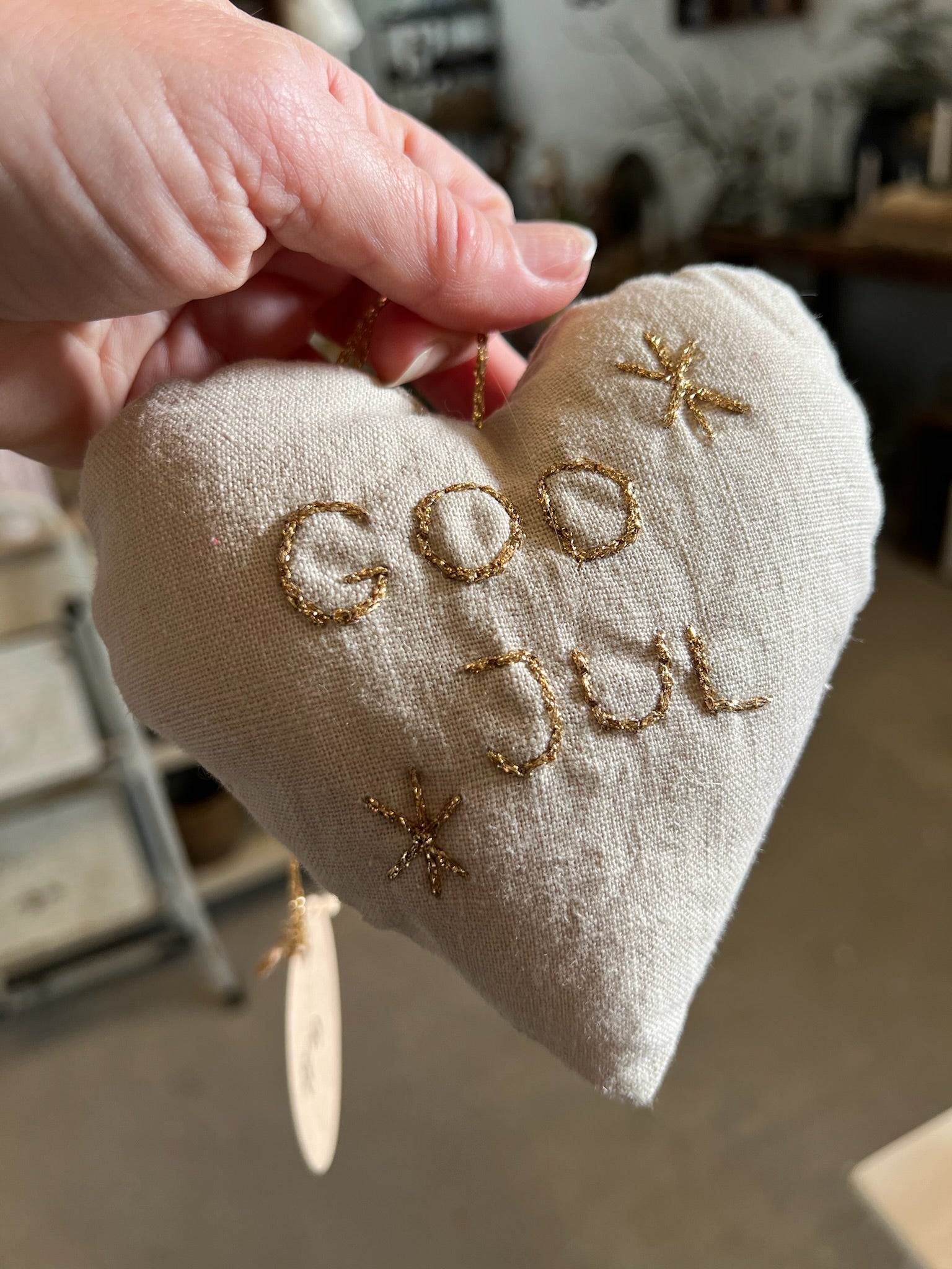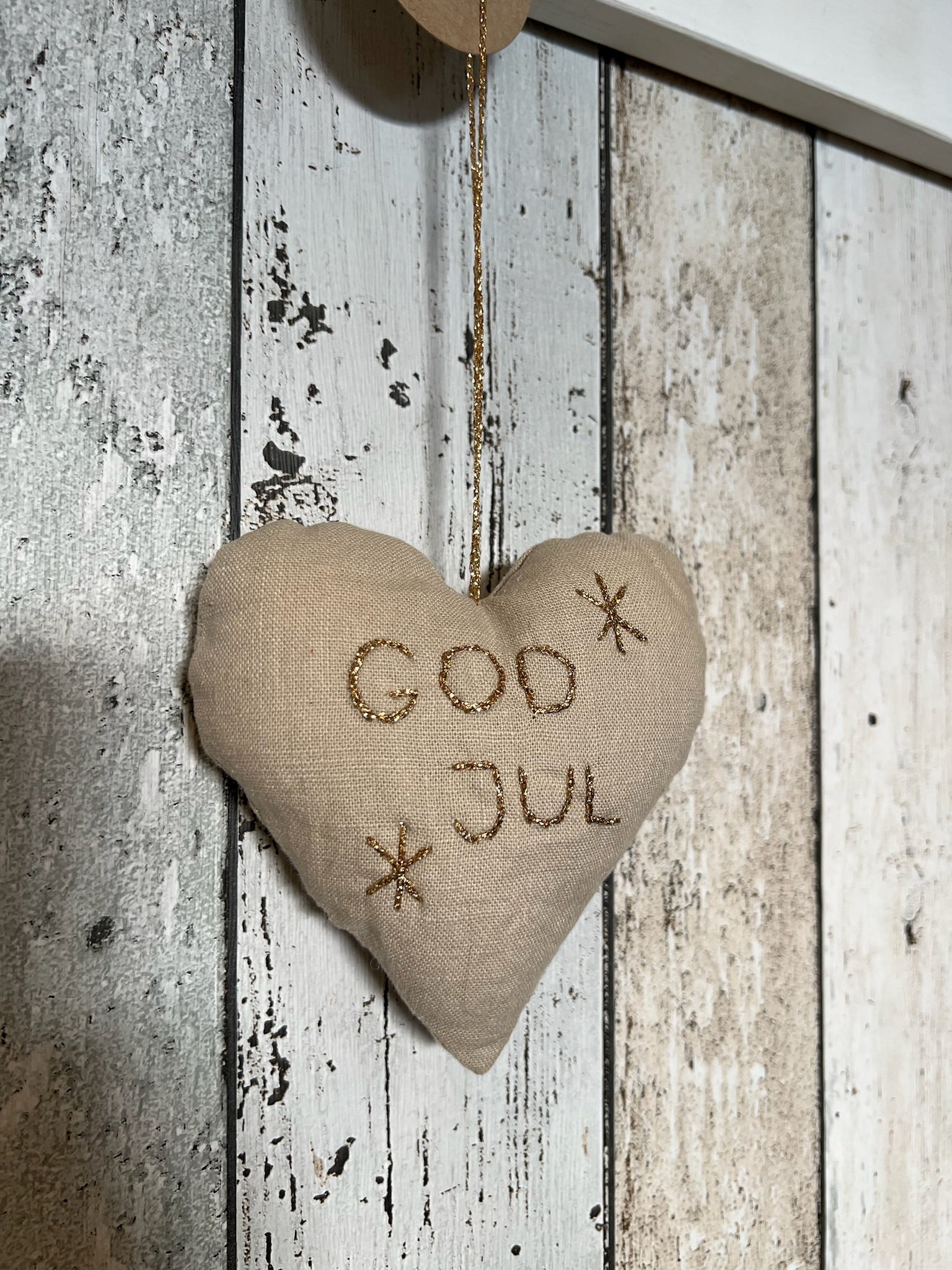Hjerte i hør med skrift fra Petite Kanina. På hjertet står der ‘God Jul’, og er til ophæng. Alle hjerter er håndsyet.