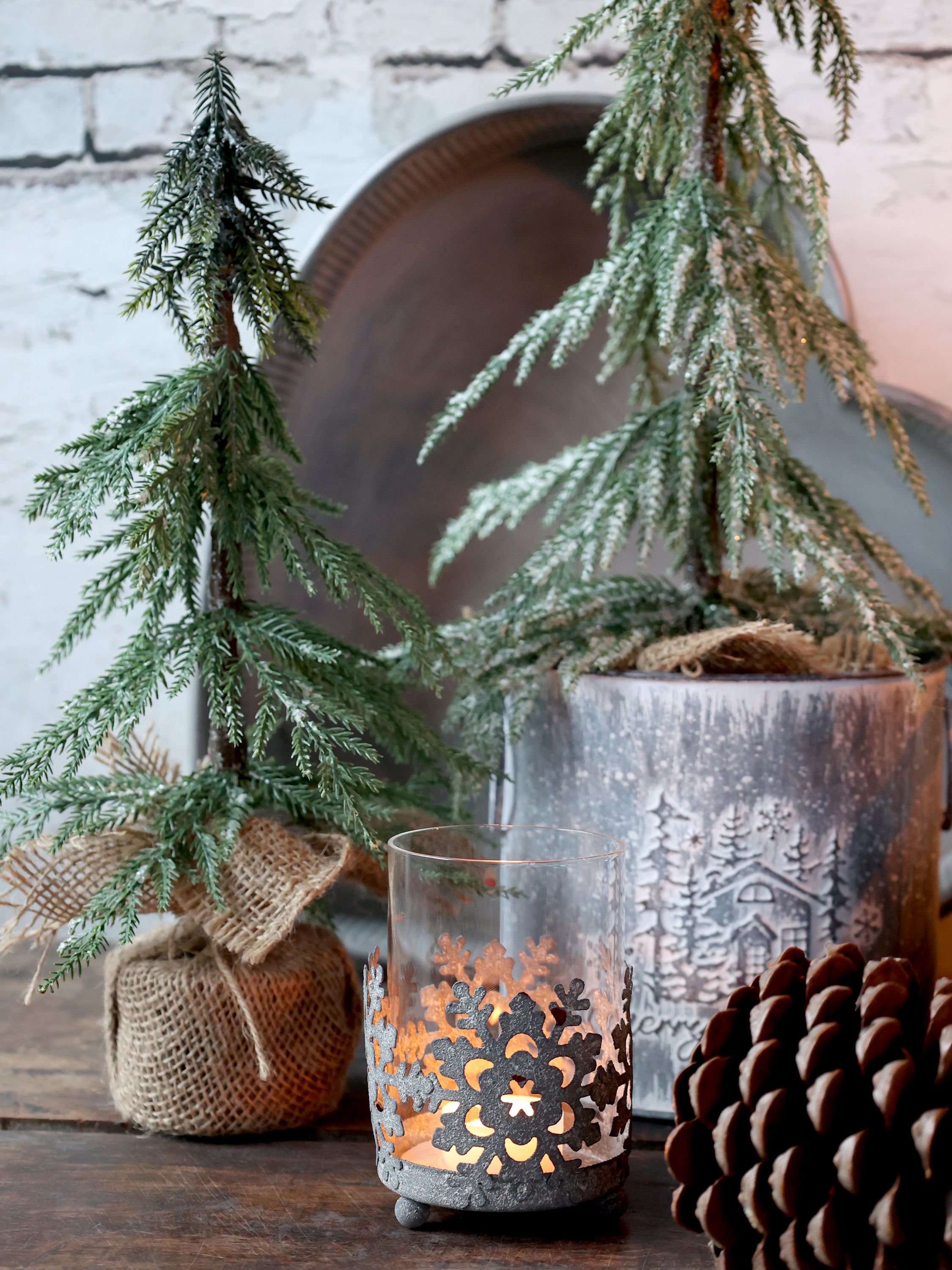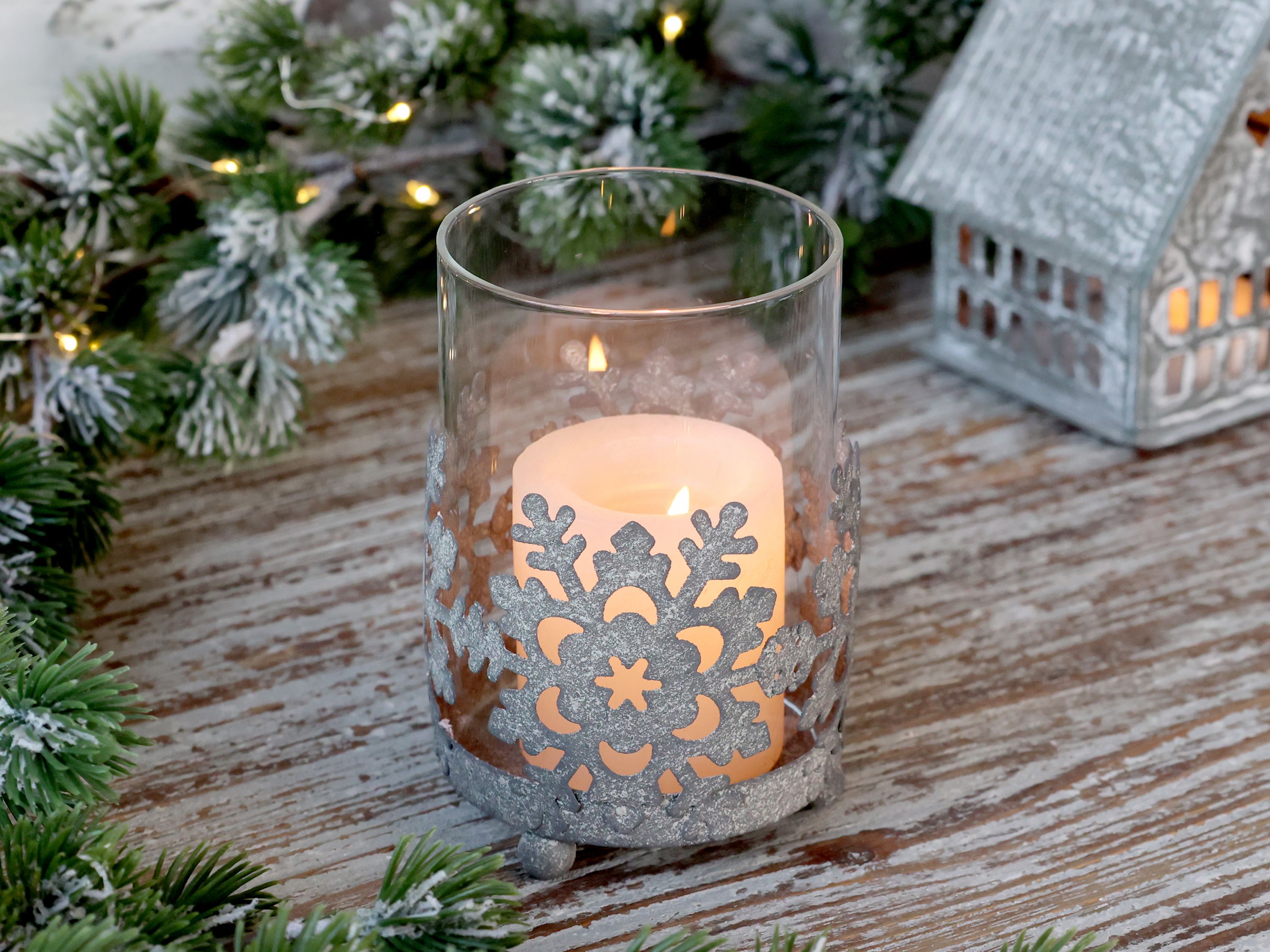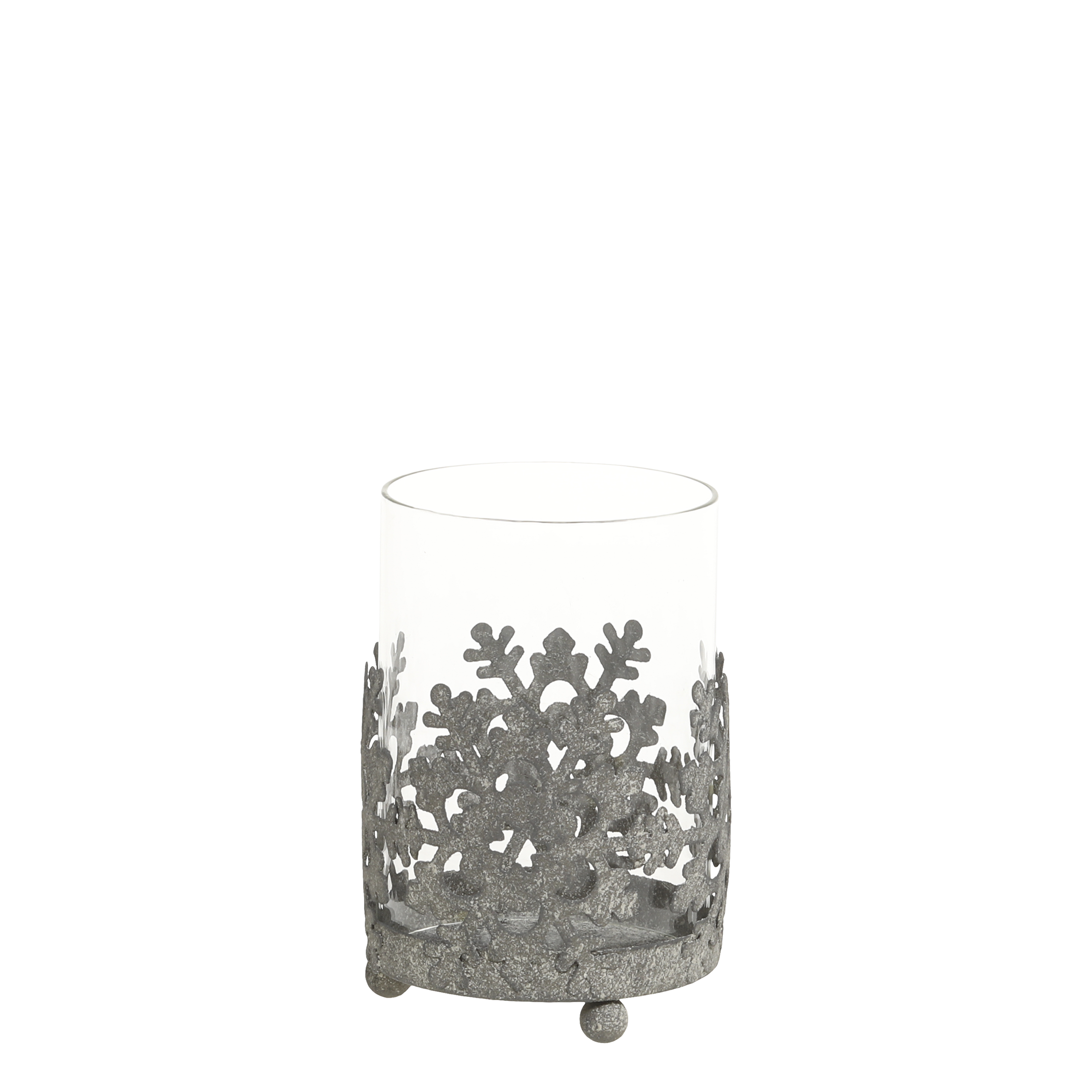 Smuk hurricane på fødder i metal i farven zink, og med glas indsats fra Chic Antique. Hurricanen har et smukt motiv med snekrystaller rundt. Rigtig fin og dekorativ hurricane. Der kan bruges fyrfadslys eller et lille bloklys i den.