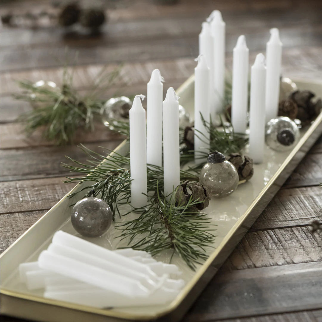 Smukke kertelys i hvid som kommer i et bundt med 10 stk.fra Ib Laursen. Kertelysene her en brændetid på ca. 1 time, og er lavet af 98,5 % parafin og 1,5 % stearin.