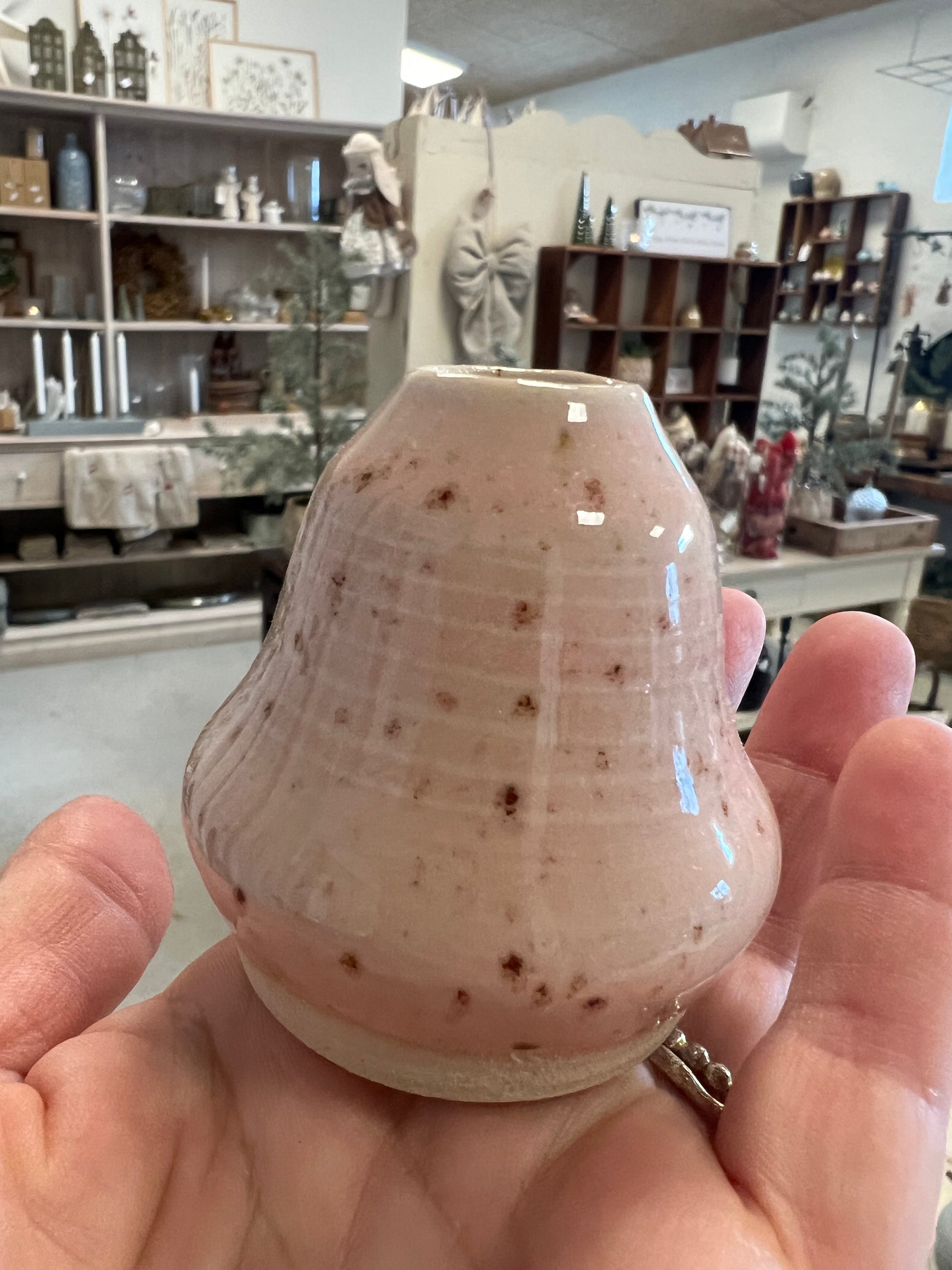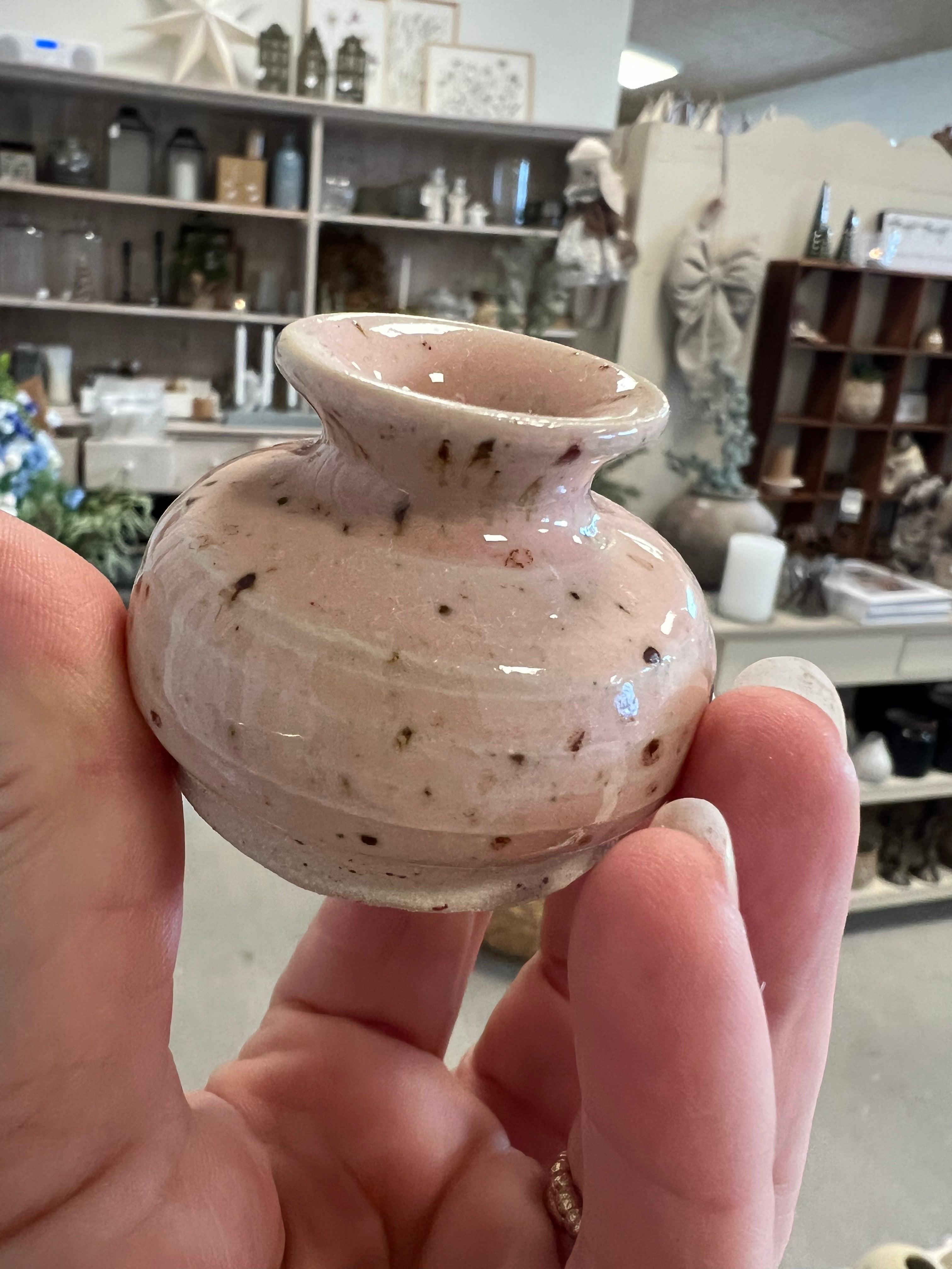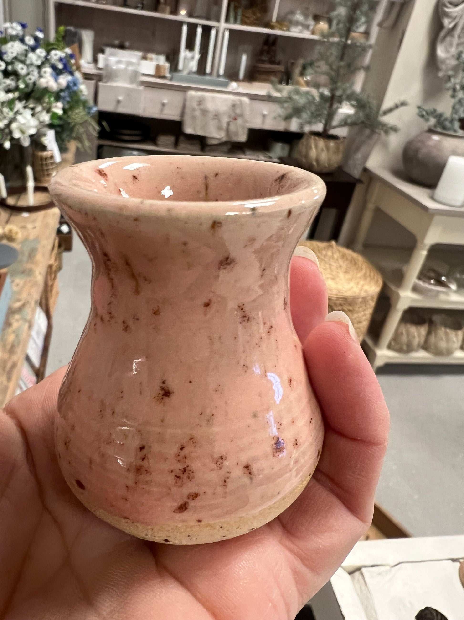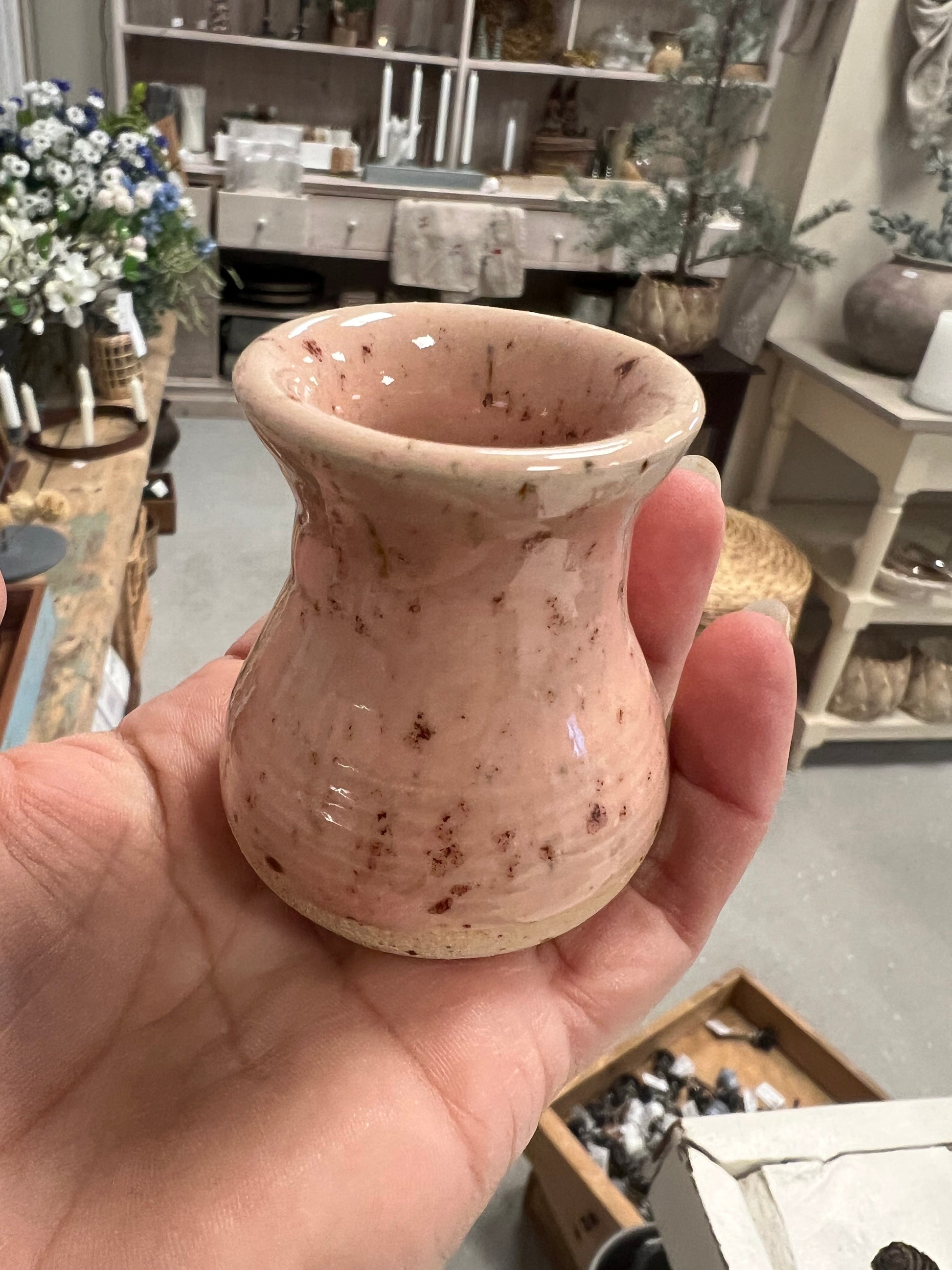 Lille håndlavet keramik vase i lyserød. Vasen har en blank overflade. Findes i flere varianter