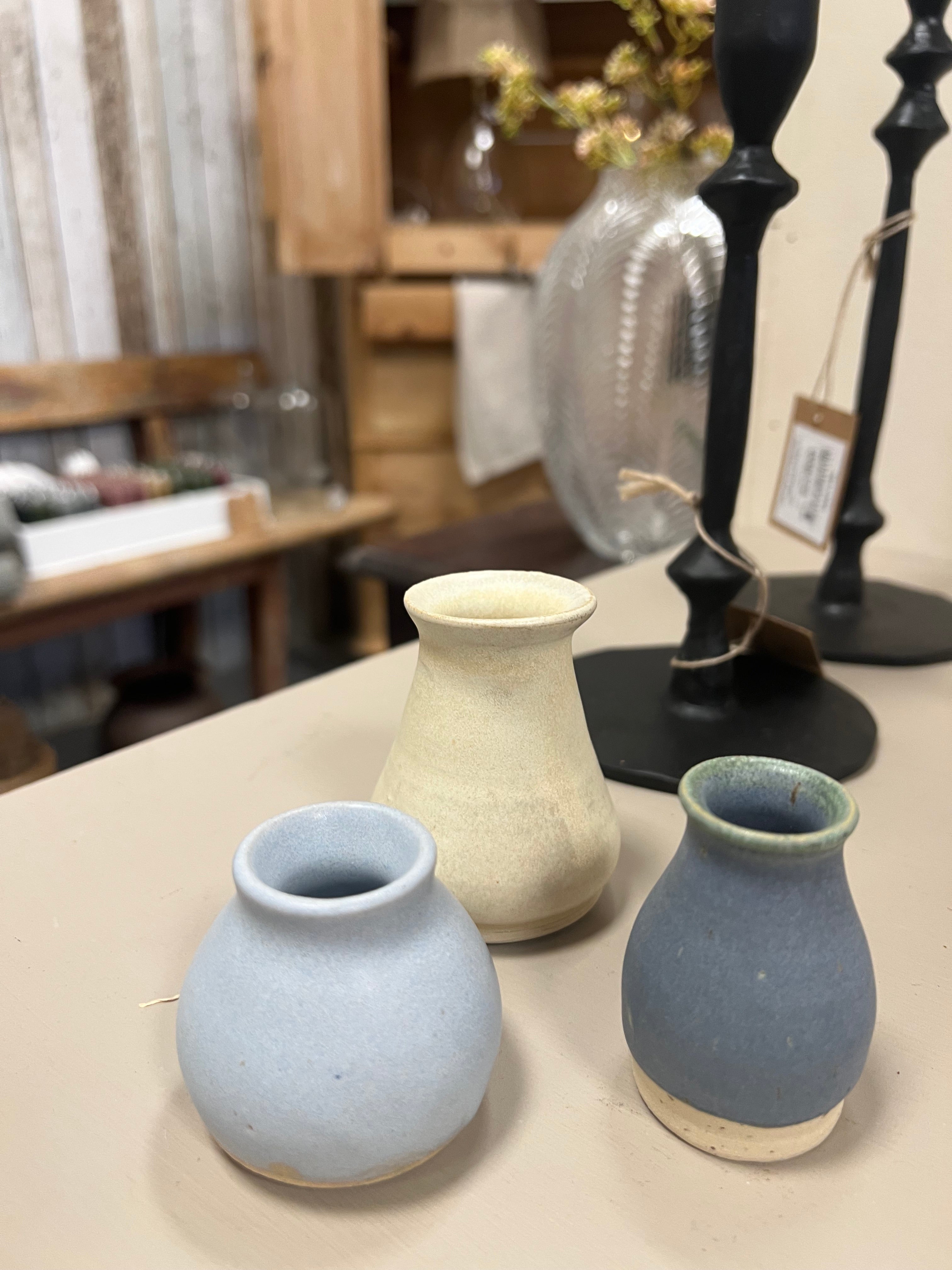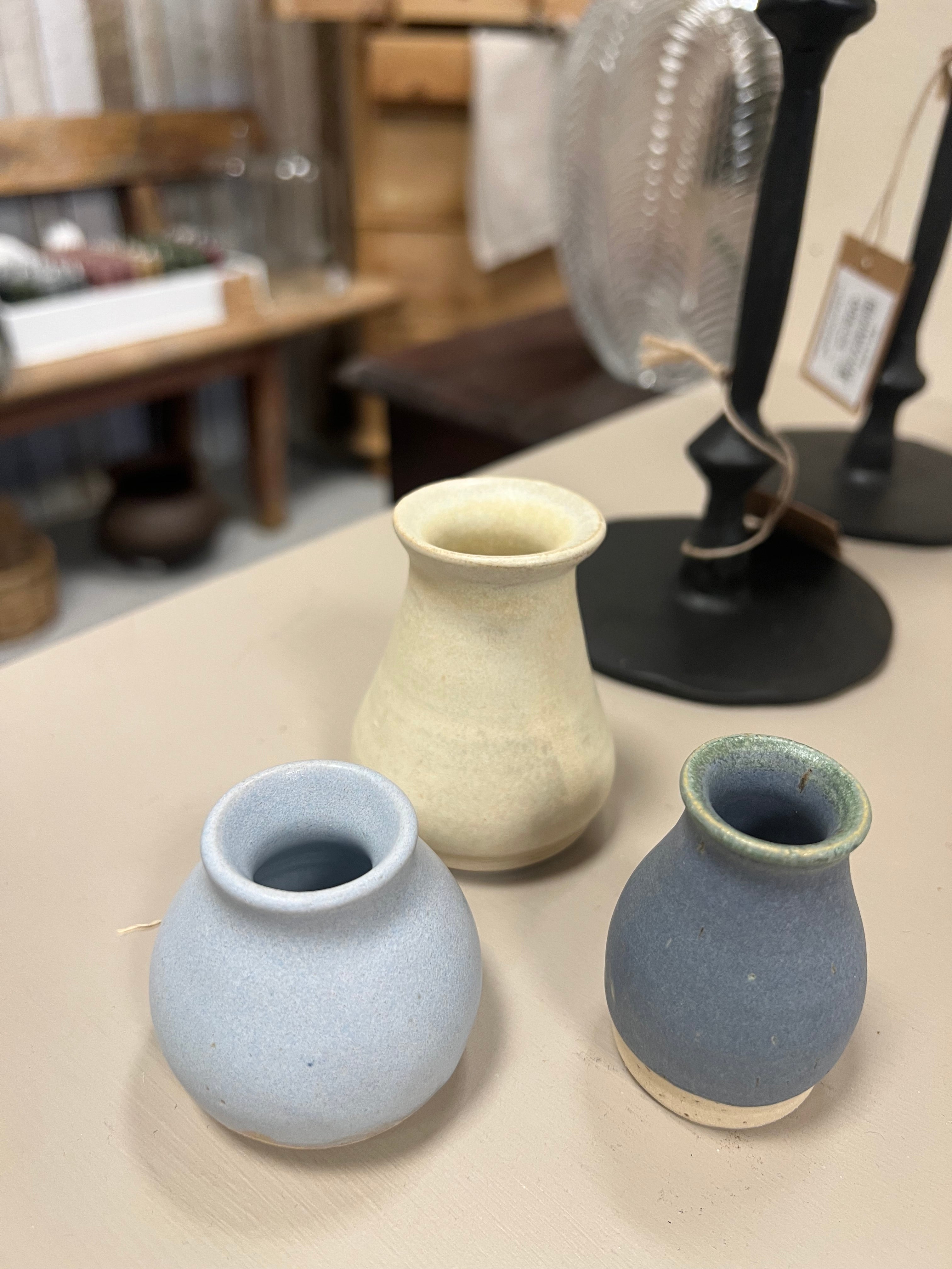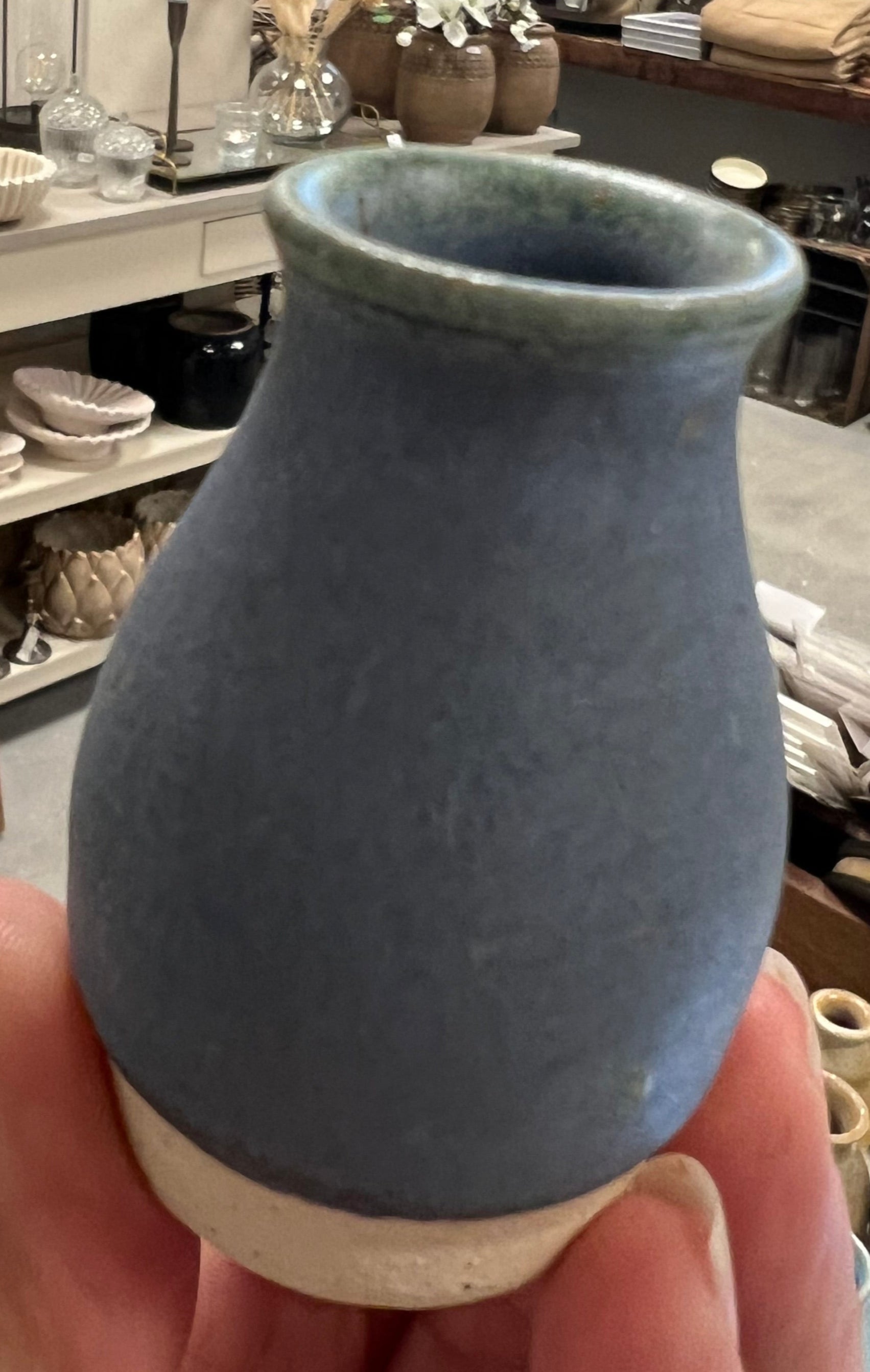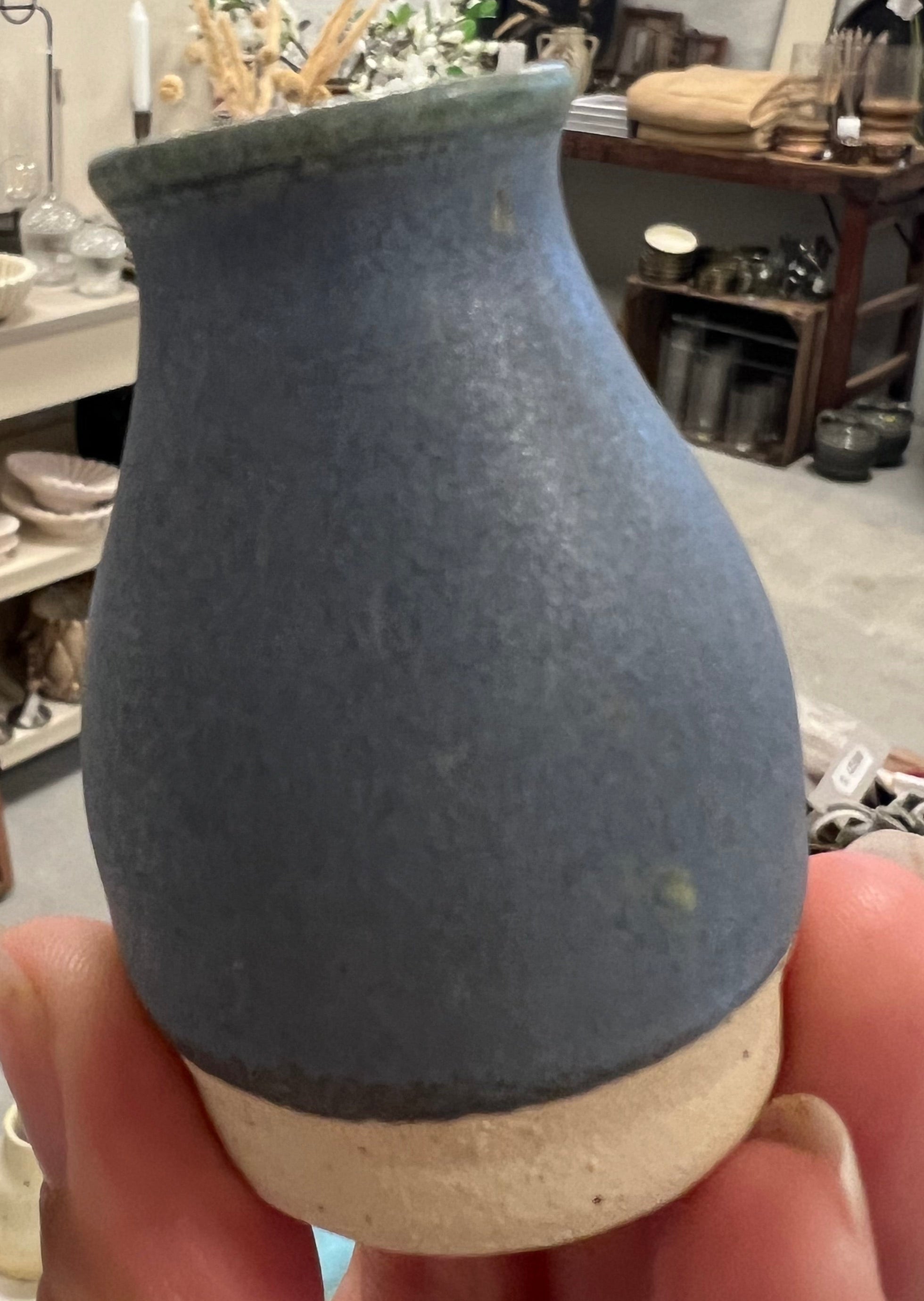Lille håndlavet keramik vase i blå med lidt grøn i glasuren. Vasen har en mat overflade.