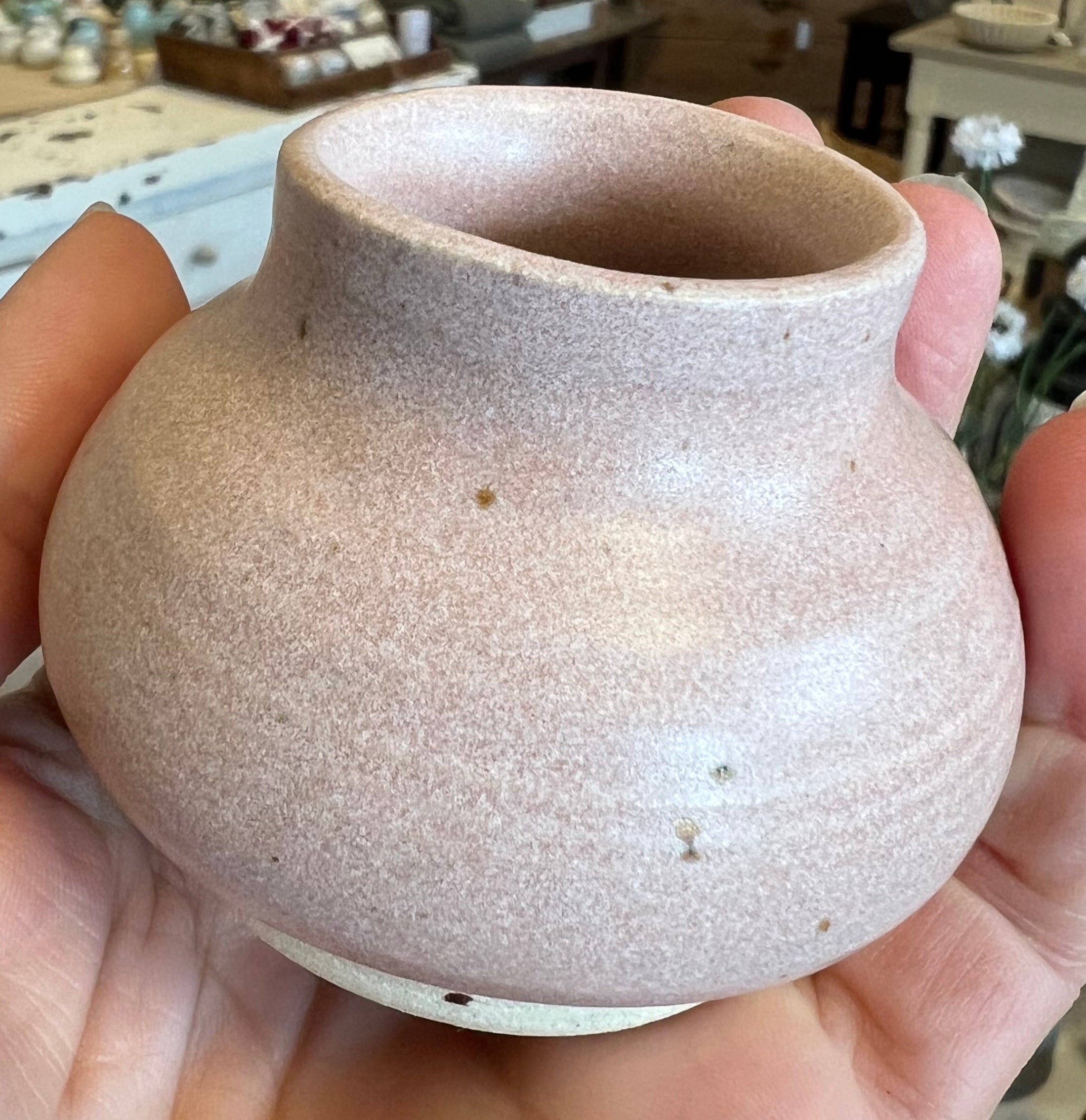 Fine lille håndlavet keramik vaser i en flot rosa farve. Vasen har en fin mat overflade. Heidi fra Vangs Keramiske Værksted i Ringe har lavet disse smukke vase, og hver vase er unik. Vasen er fin til pynt i sig selv, men vil også være fin med en lille blomst i.