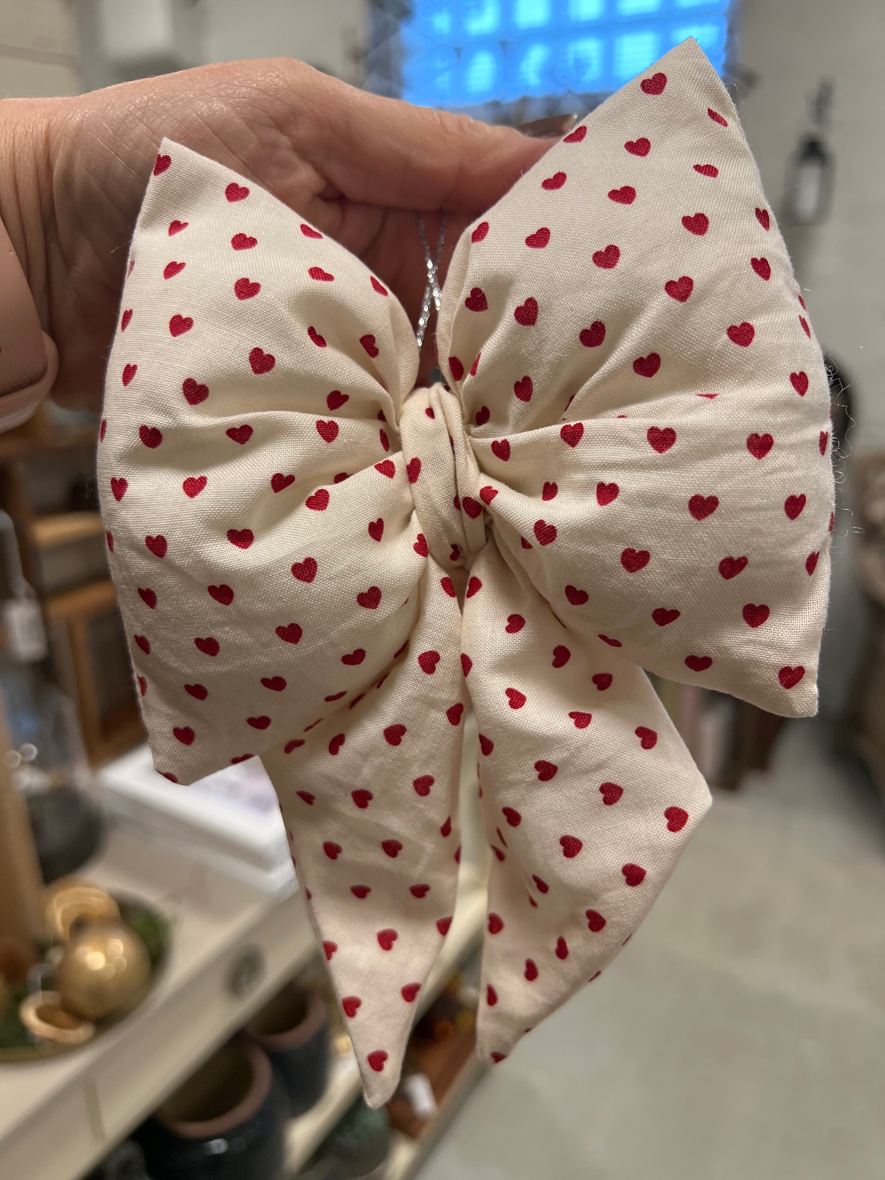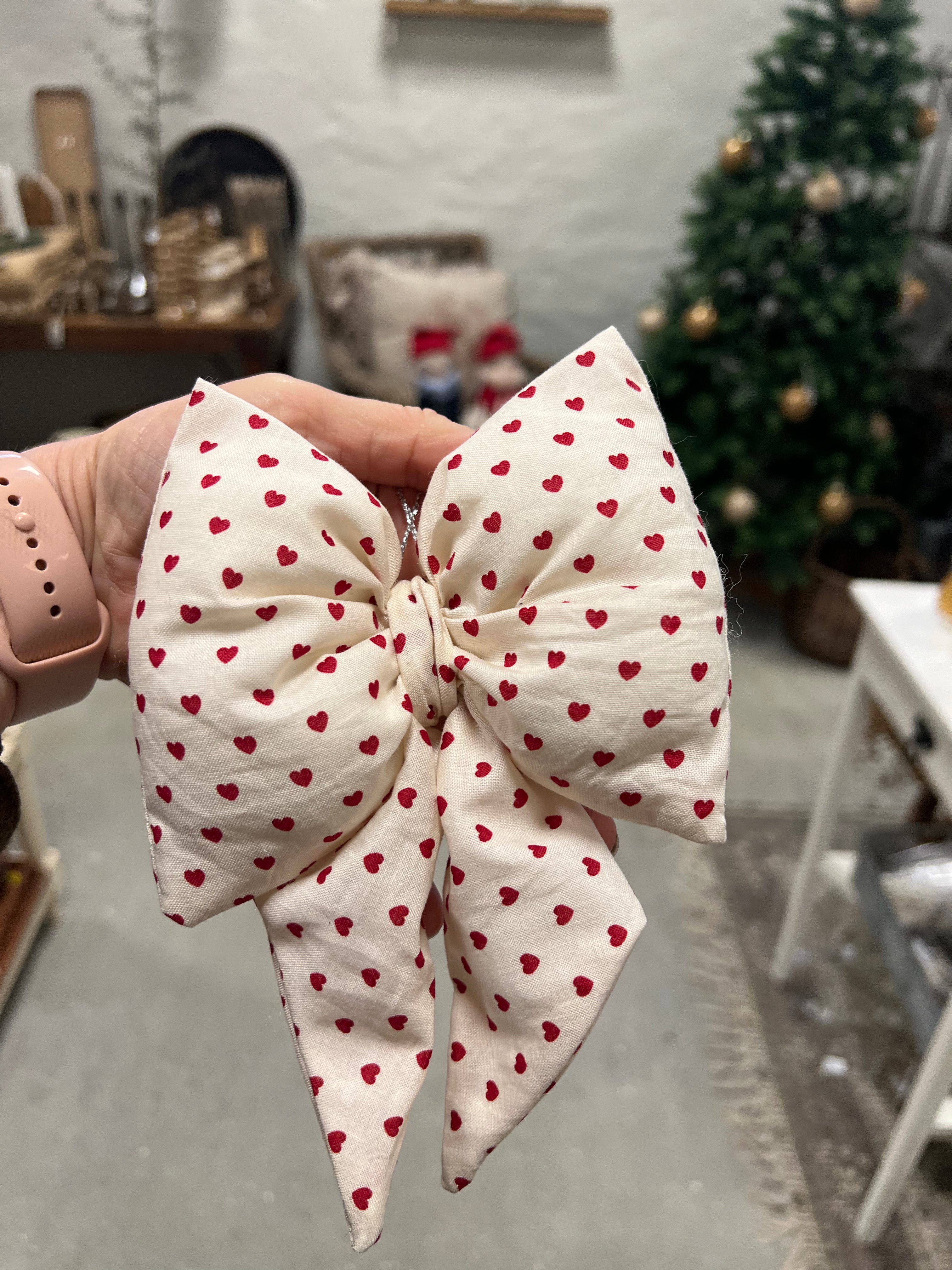 Håndsyet sløjfe fra Petite Kanina. Sløjfen er i hvid bomuld med røde hjerter. Ophænget er en tynd sølvfarvet snor.