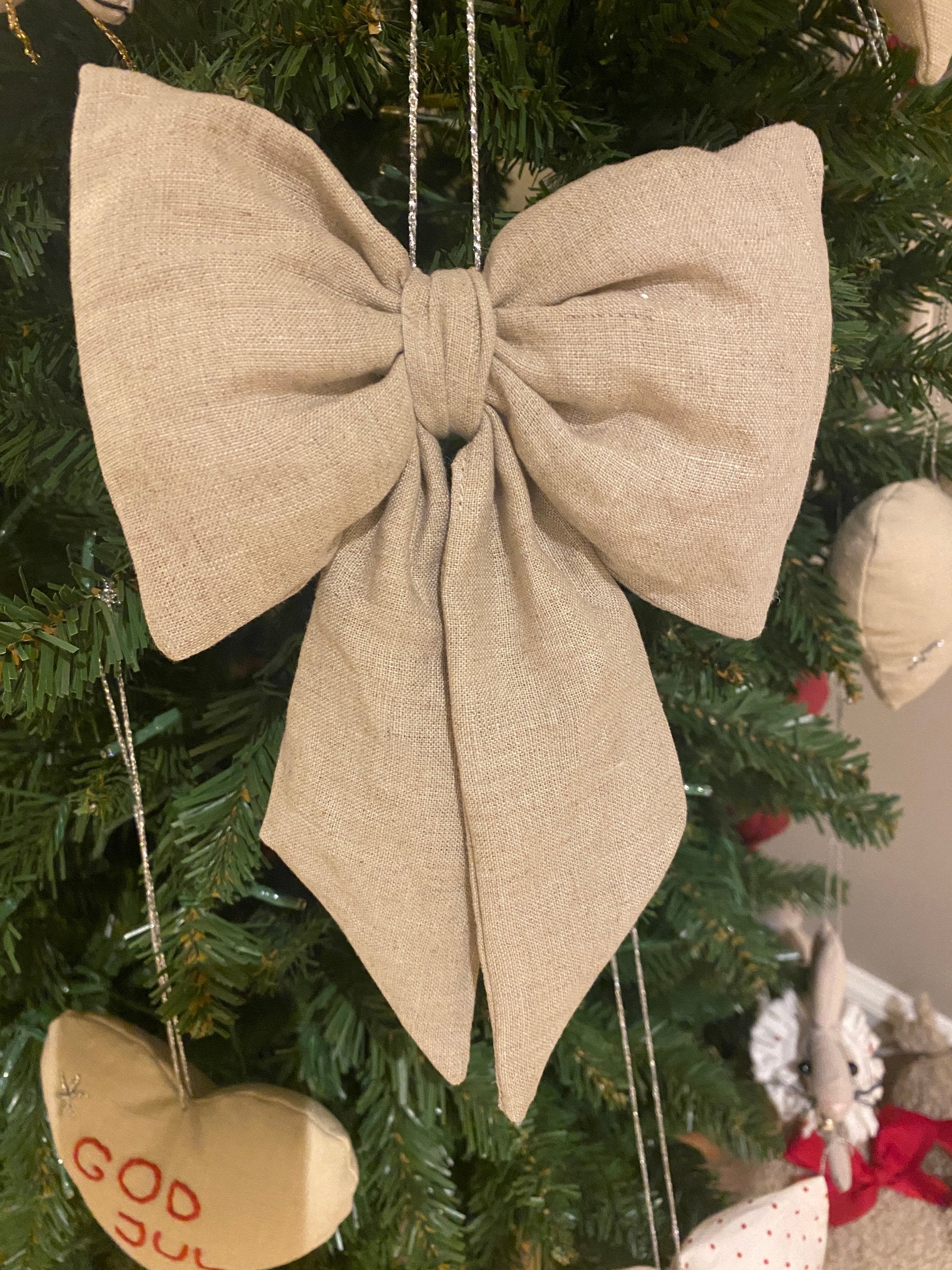 Håndsyet sløjfe fra Petite Kanina. Sløjfen er i grå/beige hør. Ophænget er en tynd sølvfarvet snor.