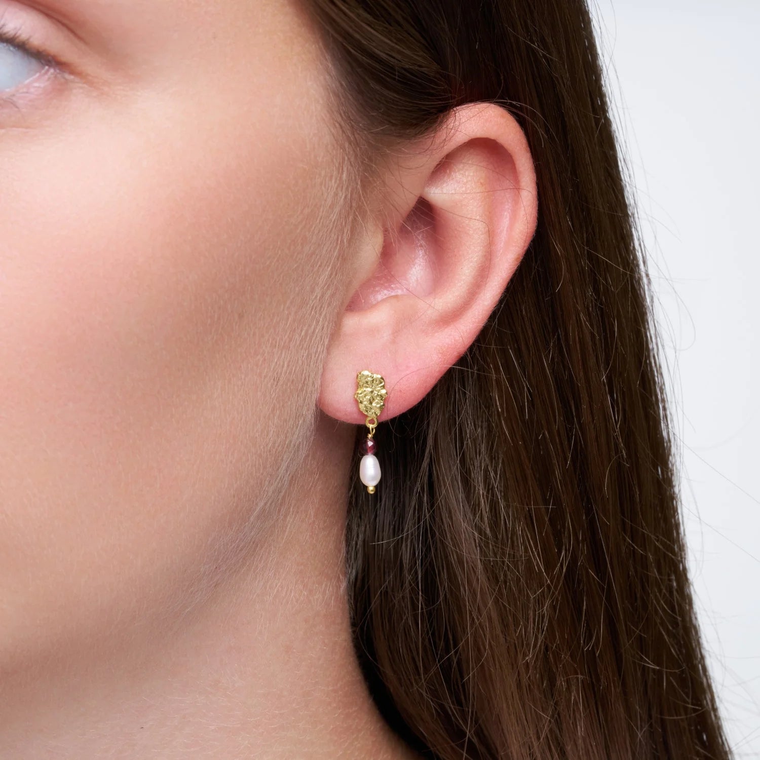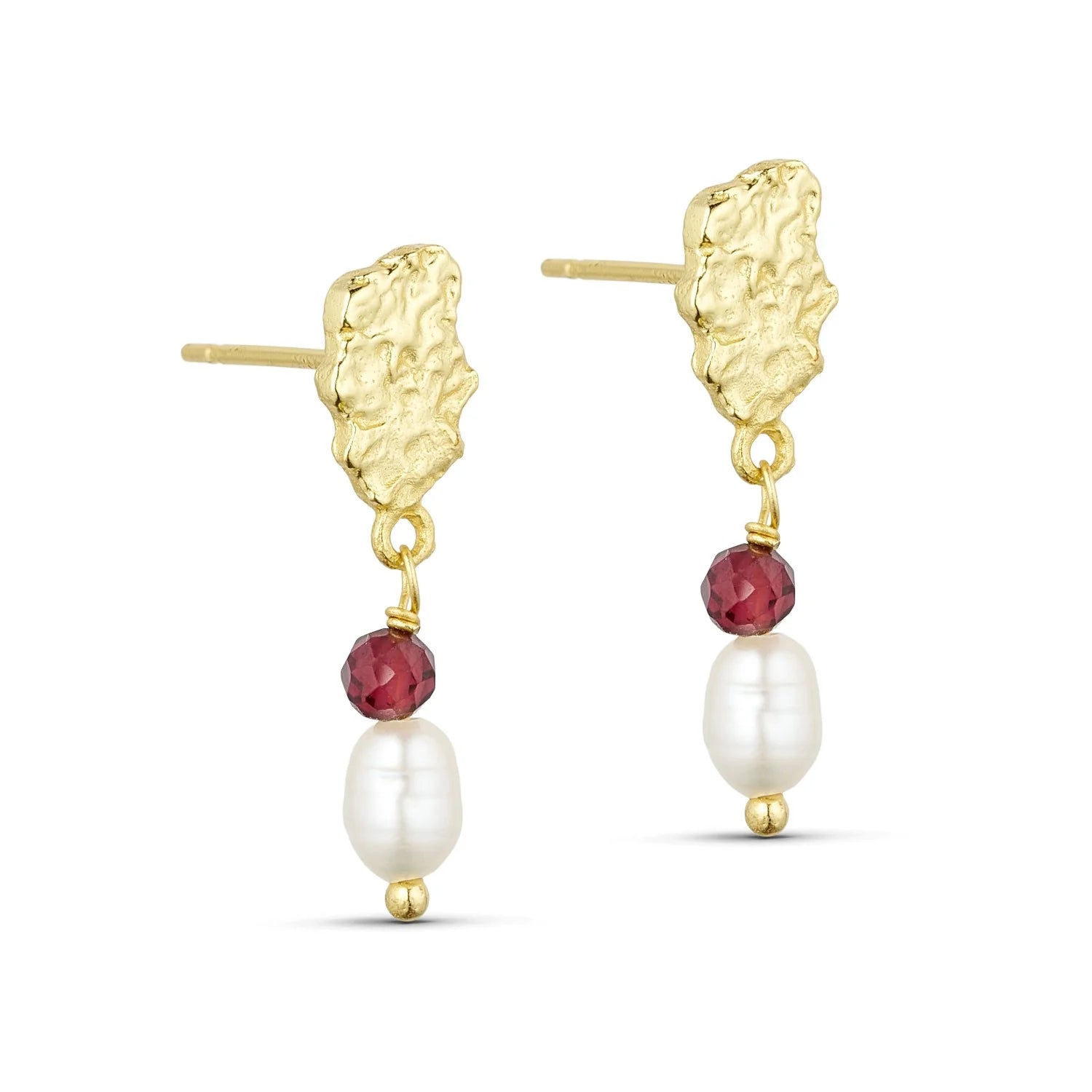 Smukke håndlavede stift øreringe med et lille perle vedhæng og en natur perle fra den danske firma Pure by nat. Øreringene er elegante og har et fint og iøjefaldende look. Øreringende er 24 K guldbelagt messing, og vedhænget er en lille ferskvands perle og en lille rød smoky kvarts. Smukke øreringe som kan passe til enhver lejlighed, og er også en rigtig god gave ide.