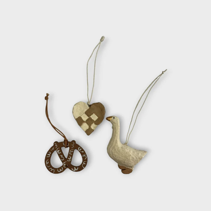 Håndlavet og unik sæt med julepynt til ophæng fra det danske firma OX Handcraft som laver fine ting af genbrugspapir, bomuldsrester og rismel. Der er tre dele i dette sæt, en gås, et flettete julehjerte og en kringle, som alle er fine at hænge på en gren, juletræet eller i vinduet, som servietring, eller til bordpynt. De har alle snor til ophæng. Fin og unik sæt med julepynt.