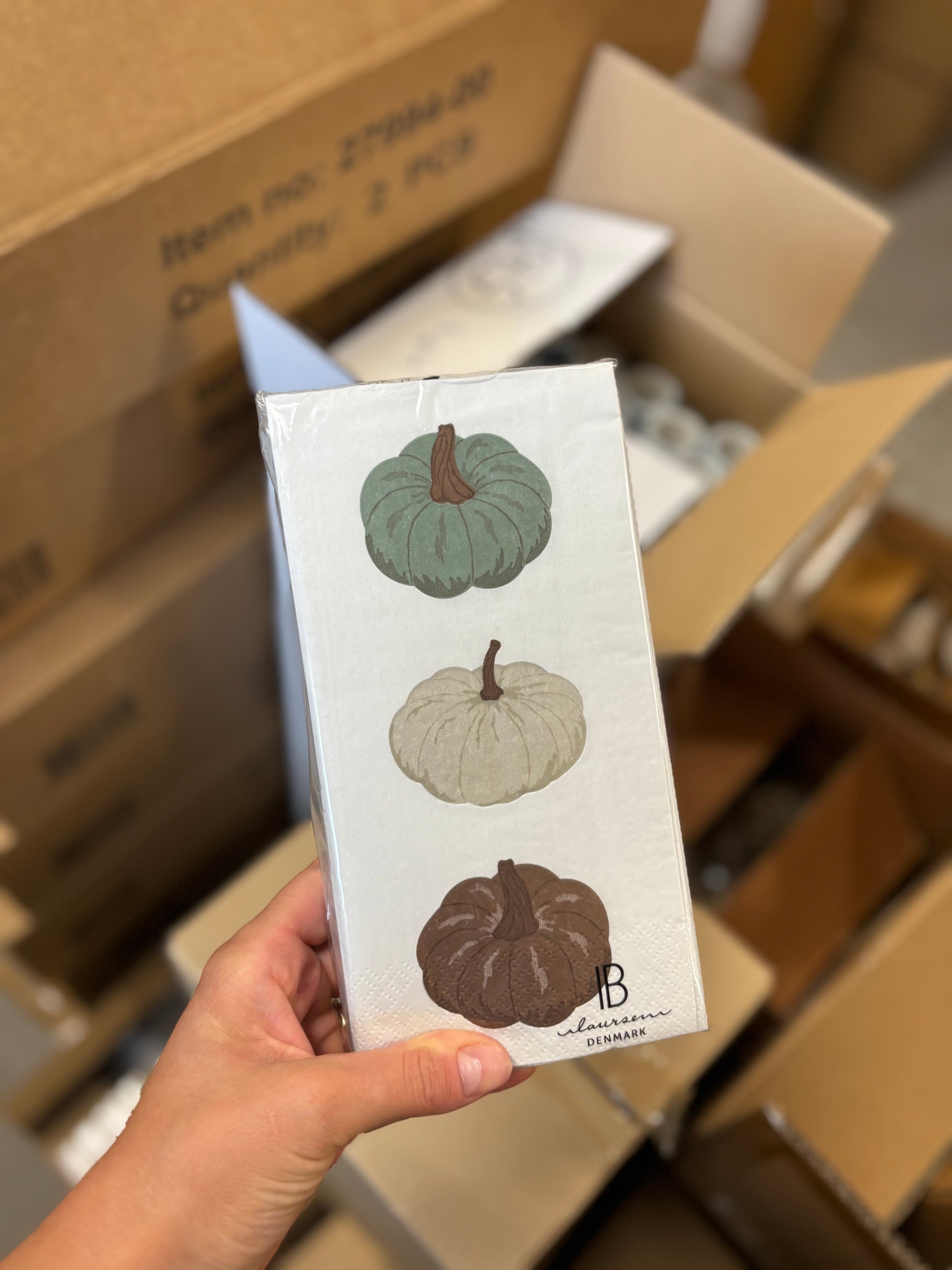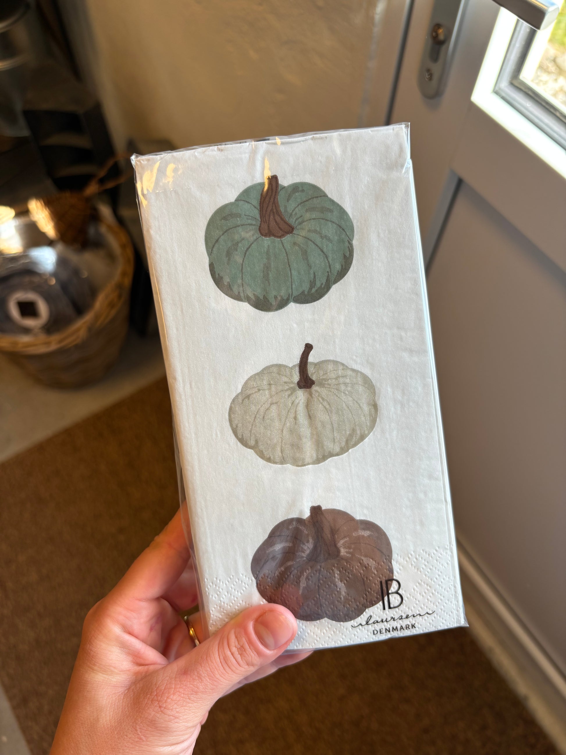 Smuk aflang efterårs papirs serviet fra Ib Laursen med et motiv af tre græskar i smukke efterårs farver. Servietten er aflang og er fra Ib Laursen. Der er 16 stk i en pakke.