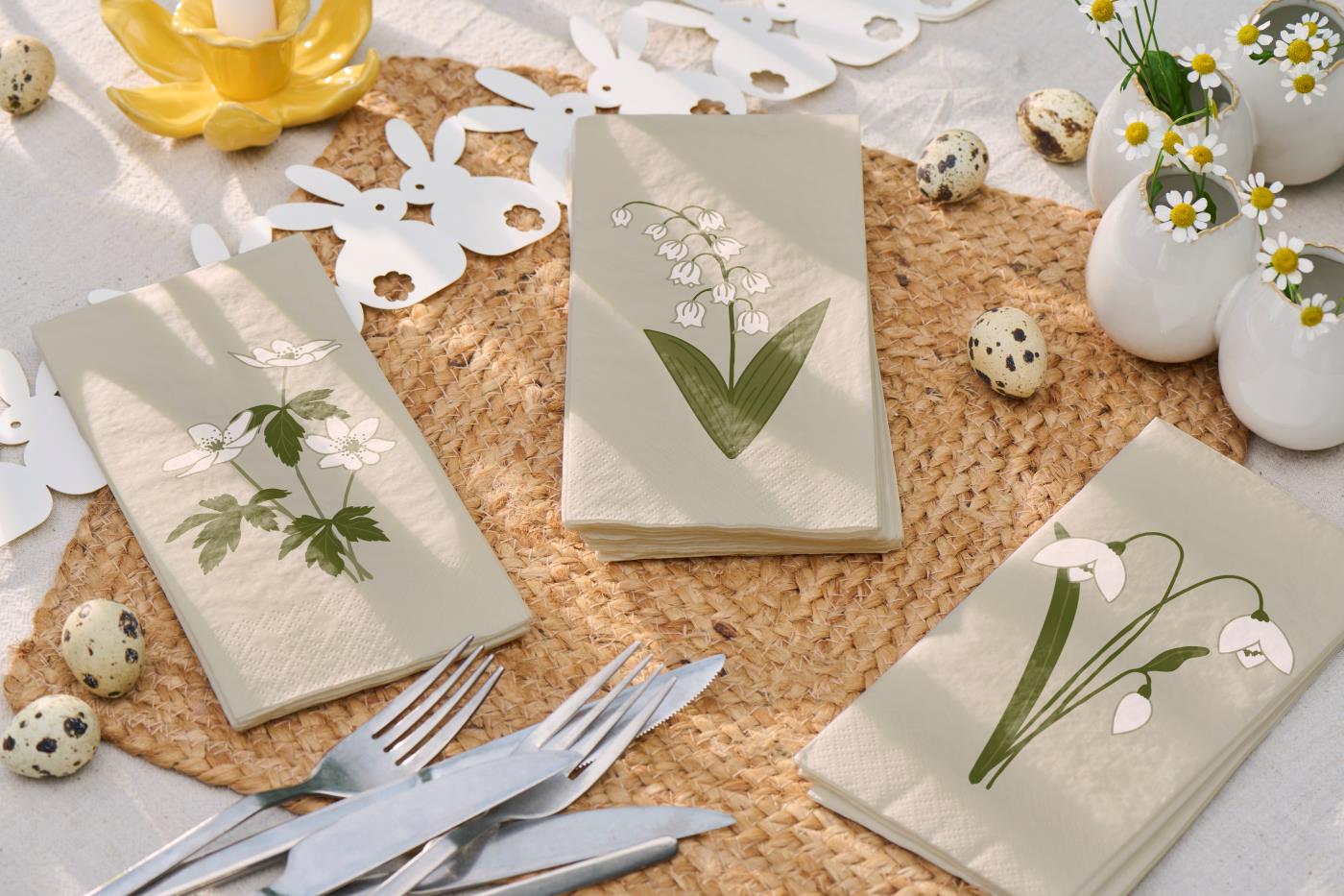 Flotte servietter med et smukt forårs motiv vintergækker fra Ib Laursen. Servietterne er aflange, som er en skøn form at ligge på en tallerken når der skal dækkes et fint bord.