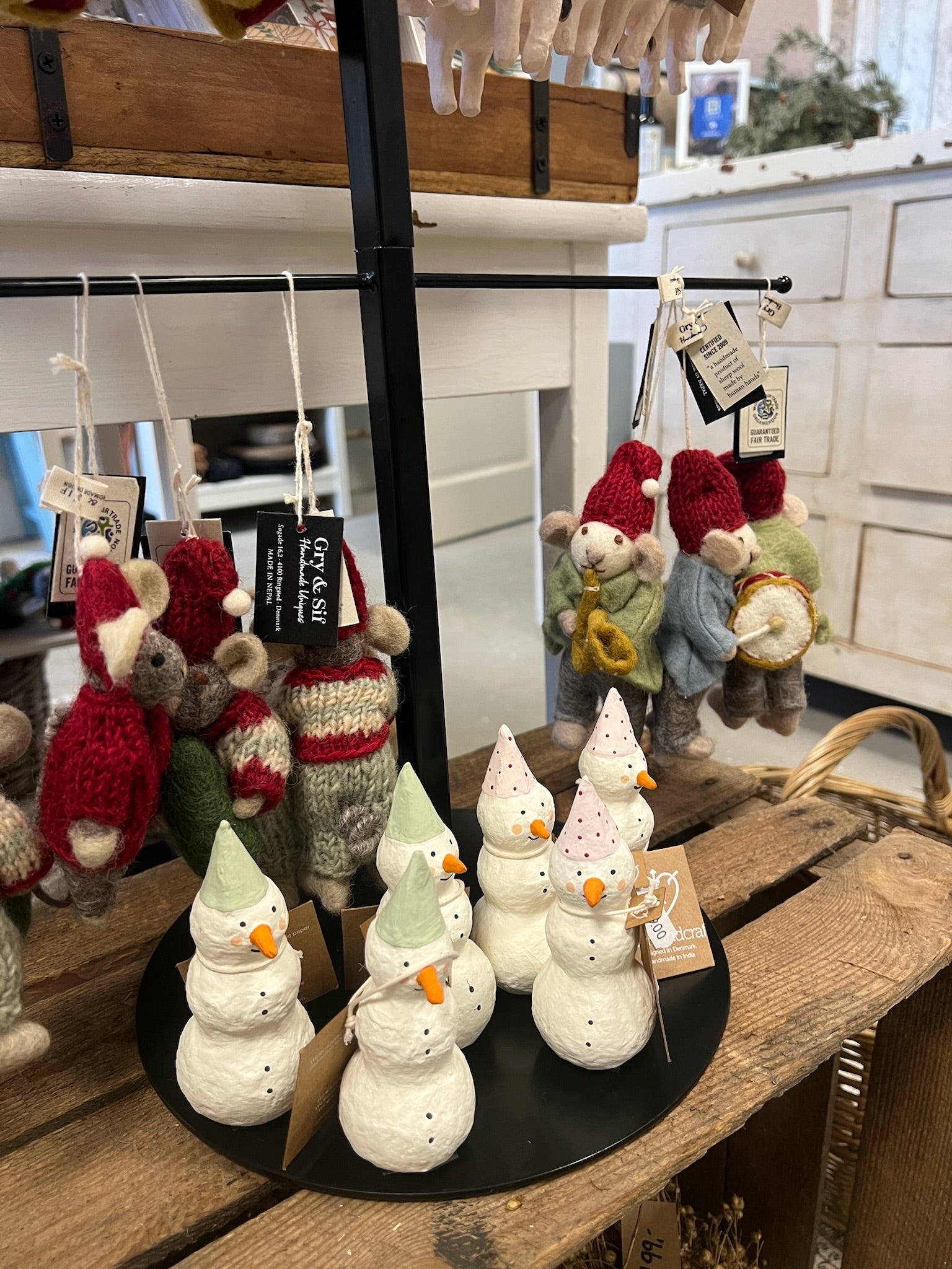 Håndlavet og unik snemand med en fin hat med prikker, fra det danske firma OX Handcraft som laver fine ting af genbrugspapir, bomuldsrester og rismel. Snemanden er fin og dekorativ pynt hele vinteren og julen. Snemanden kan stille på en hylde, et fad eller i vindueskarmen. Vælg snemand med enten lyserød eller grøn hat. Fin og unik papmache snemand