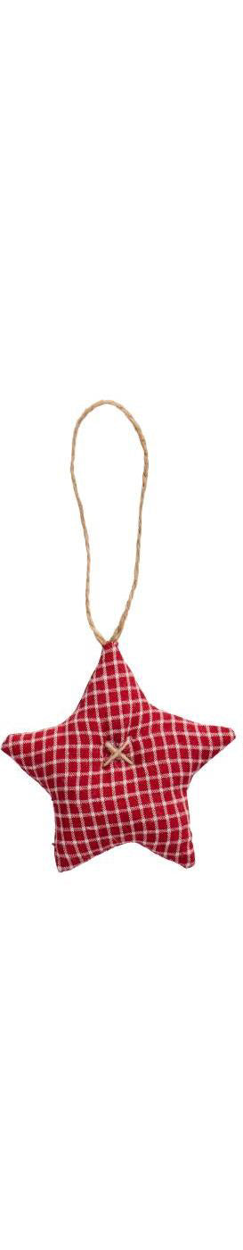 Stjerne i stof fra Ib Laursen i fem forskellige varianter. Stjernene er fine at hænge op på en gren, juletræet, brug den som servietholder eller som pakkepynt. Stjernene er i bomuld med jute snor til ophæng.