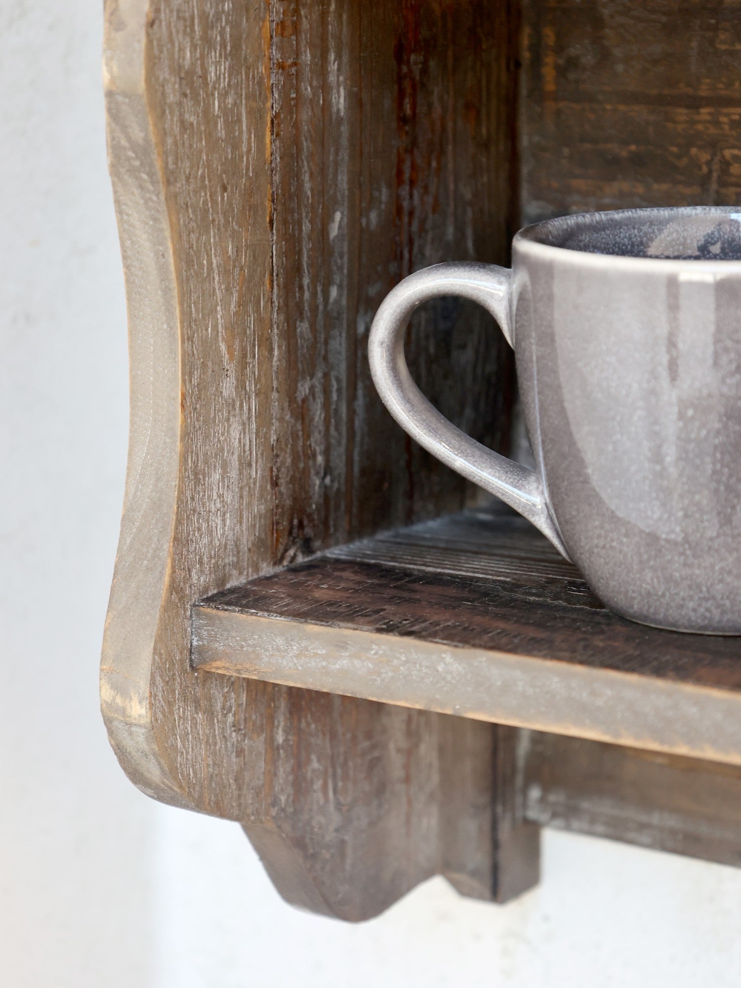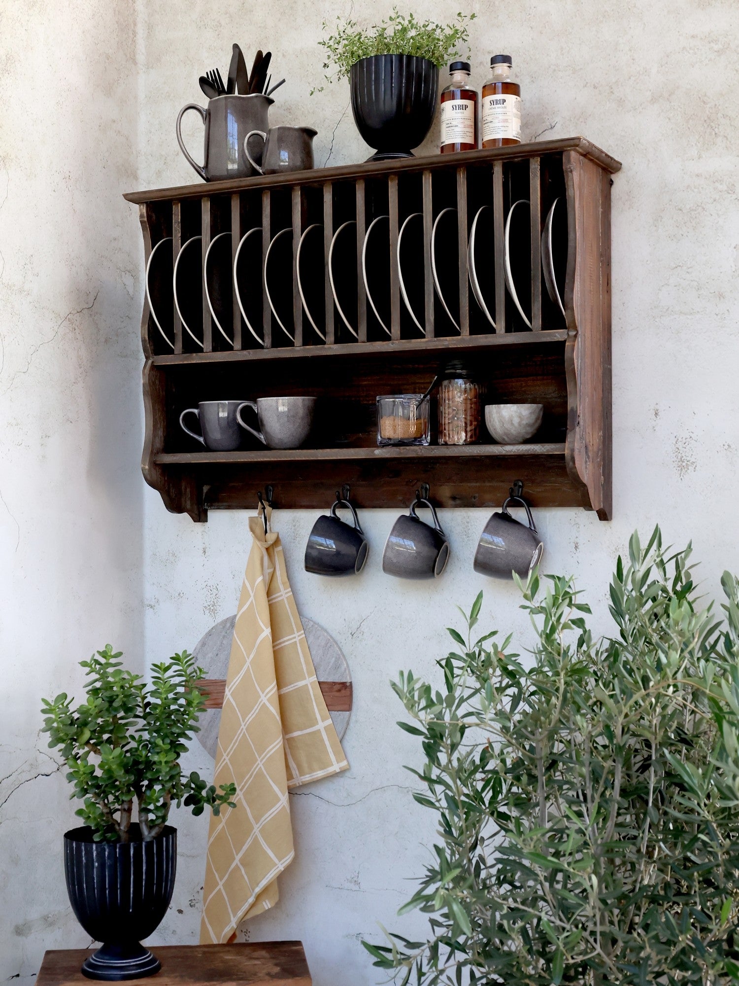 Fin tallerkenrække i genbrugstræ med en hylde og fire knage, så der kan kommet andet pynt på end tallerkener. Tallerkenrækken vil pynte i ethvert køkken, og der er plads til 12 tallerkener. Da Tallerkenrækken er lavet af genbrugstræ kan der forekomme små sprækker osv i træet, og farven kan varierer.