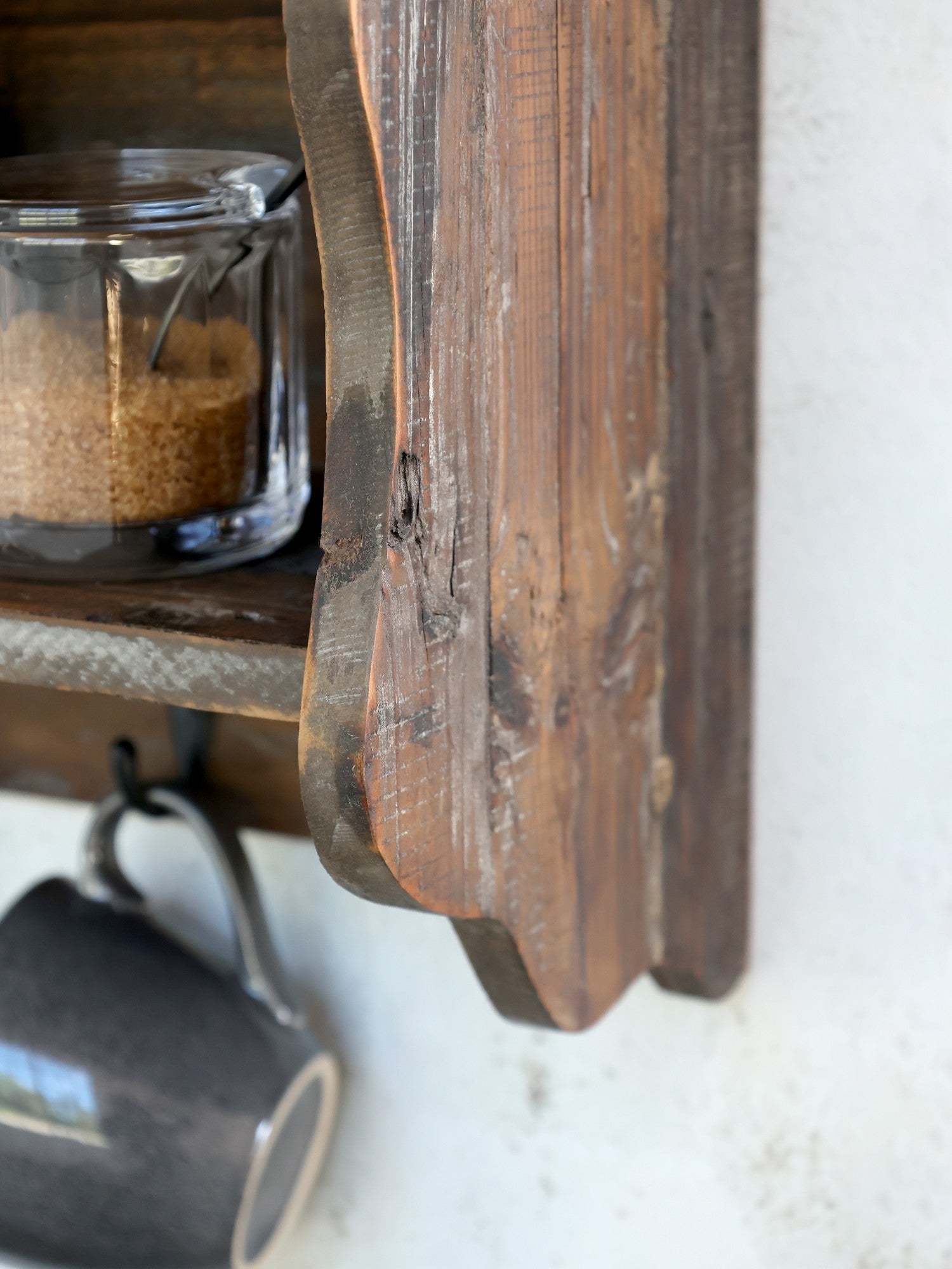 Tallerkenrække til væggen i genbrugstræ med hylde og fire knager.