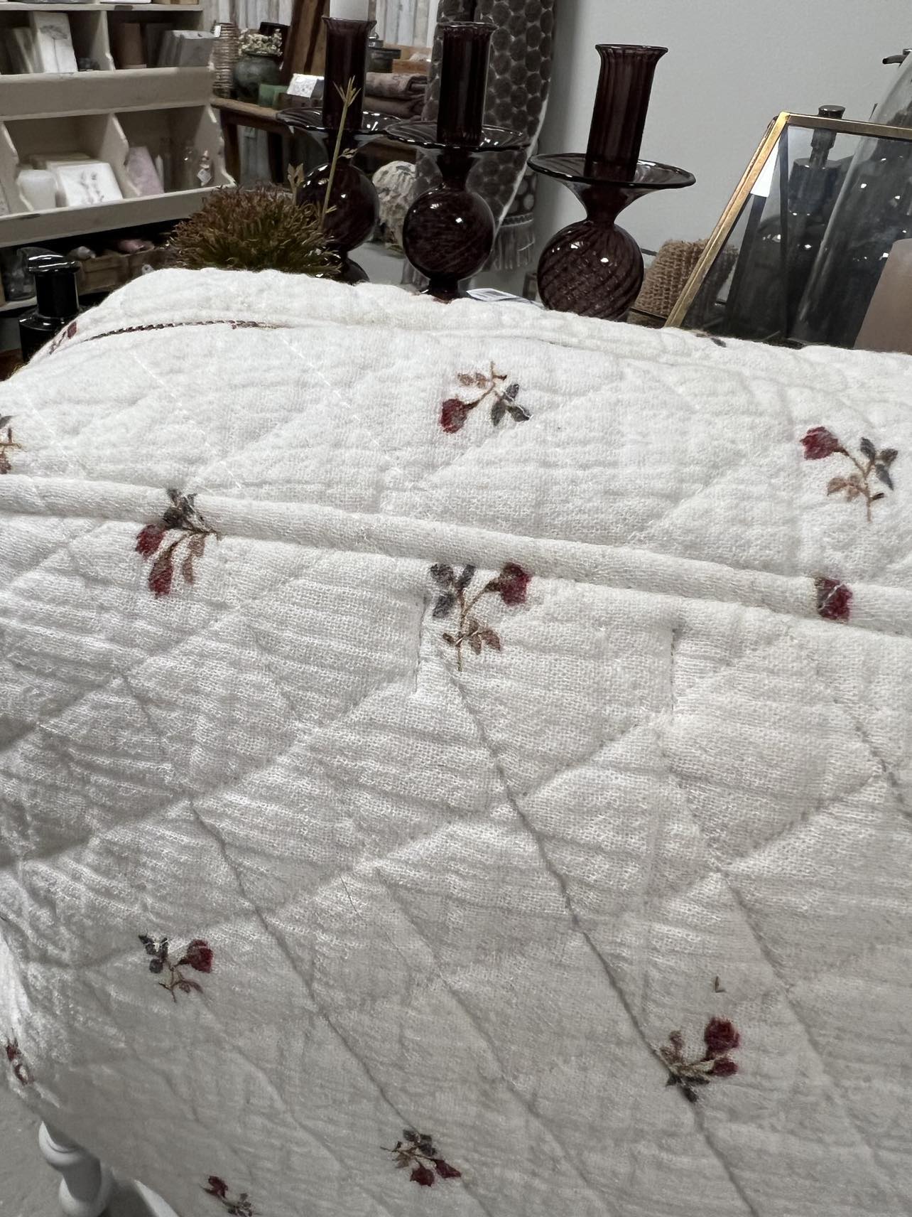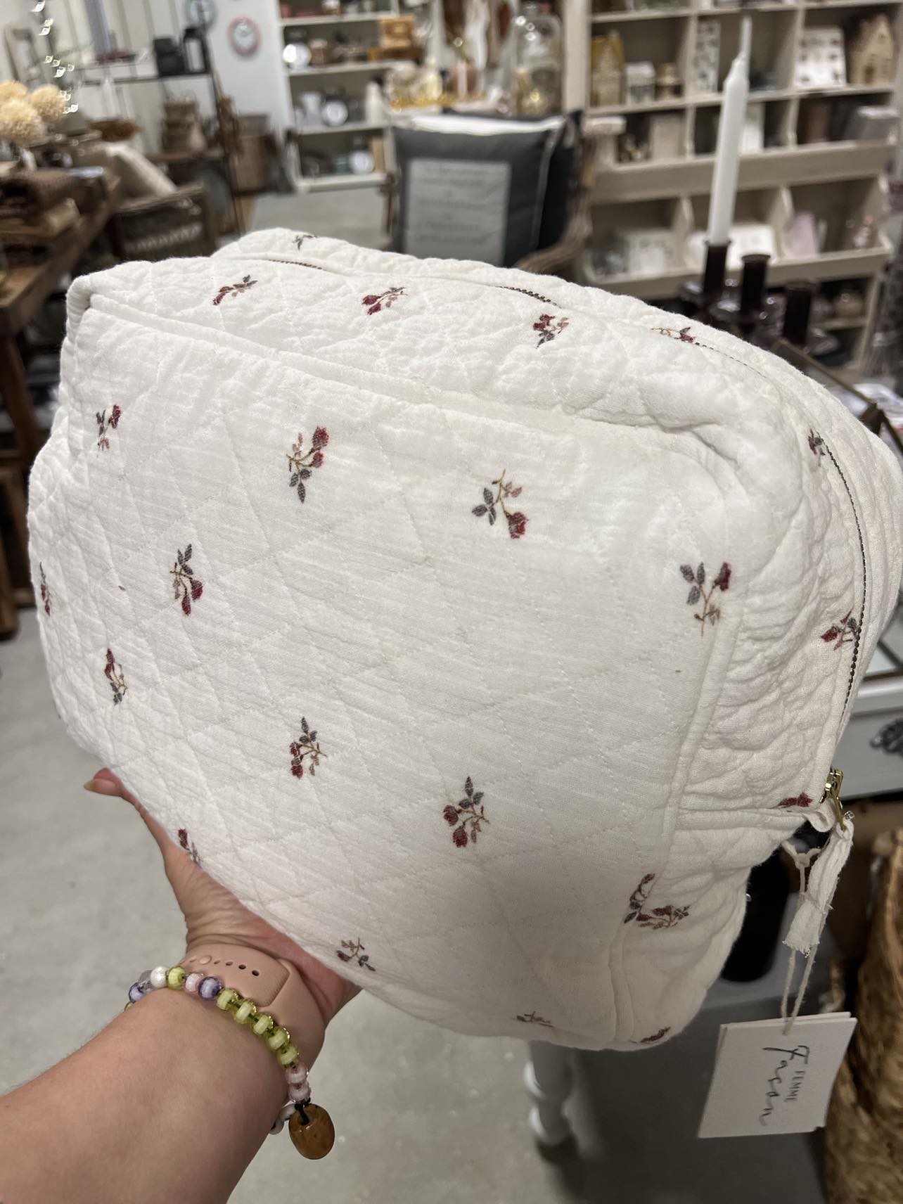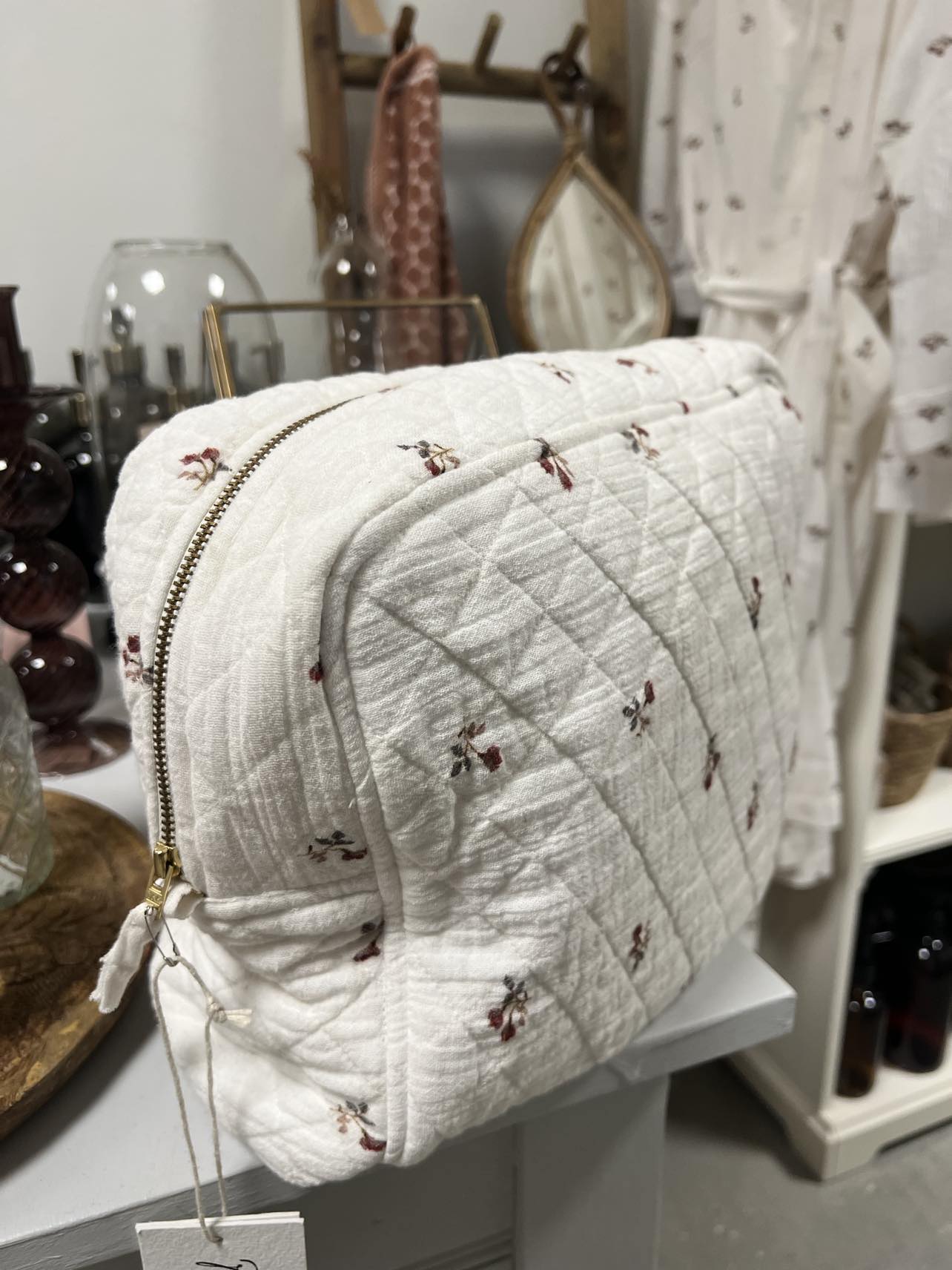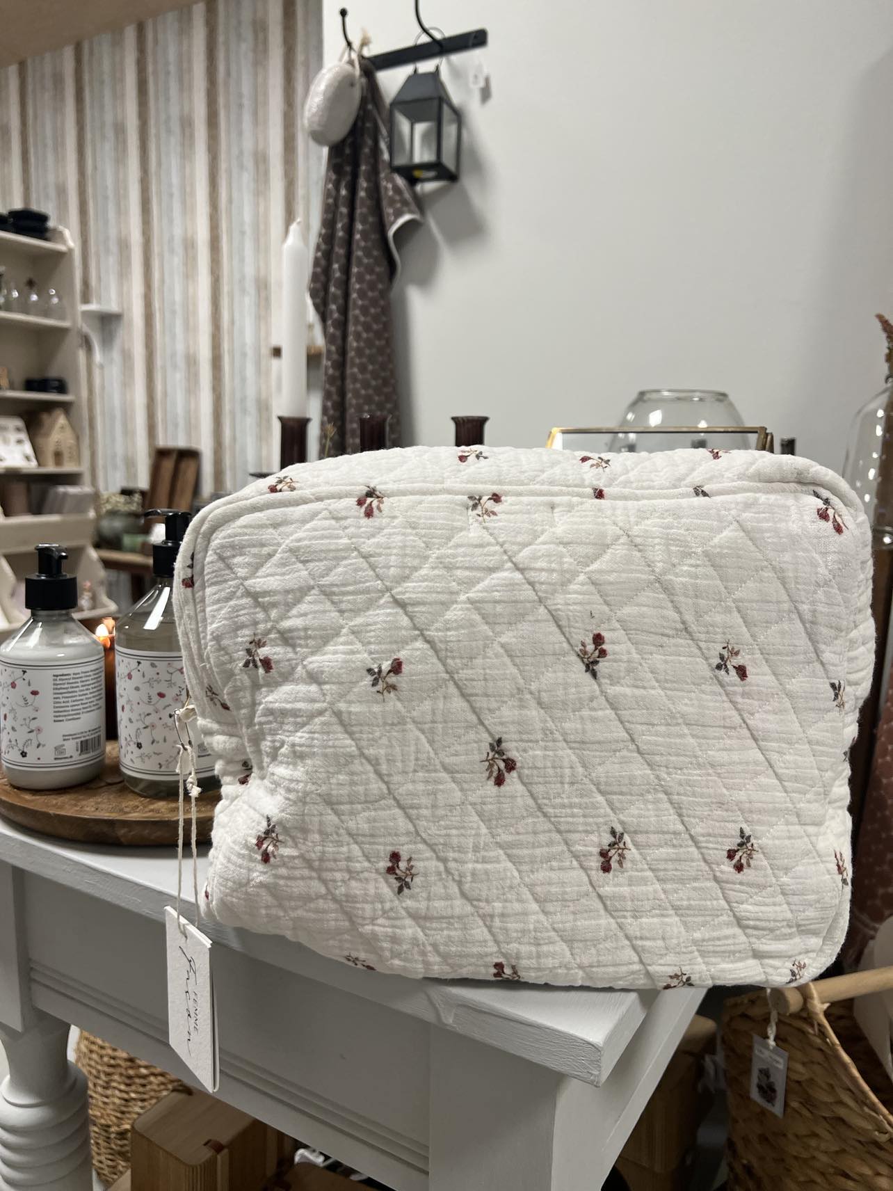 Smuk toilettaske i hvid bomuld, med små blomster i en rødlig farve, med grønne og brune blade og grene, og med en god lang lynlås i guld farvet, så det er nemt at få dine ting i den. Toilettasken har en fin størrelse, og der er god plads til dine ting, når du skal afsted på ferier og weekend besøg.