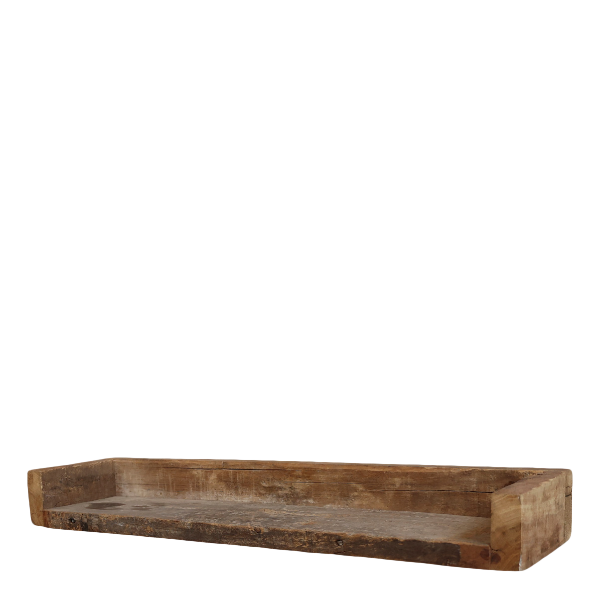 Væghylde af genbrugstræ med kanter. Hylden er lavet af indisk genbrugstræ, som stammer fra nedbrydningsmaterialer. Der vil være knaster, revner, sprækker og splinter i træet, derudover vil træsorten varierer.
