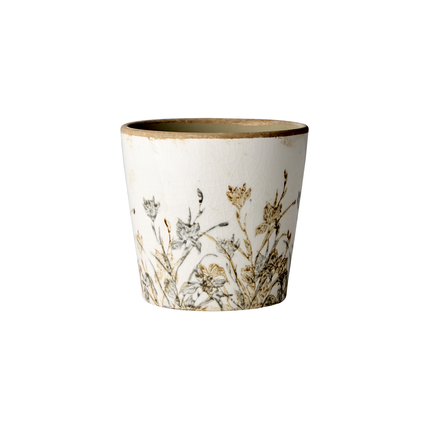 Tuva urtepotteskjuler fra Affari of Sweden i stentøj. Urtepotteskjuleren er creme farvet og har det flotteste blomstermønster i brun/beige og grålige farver. Urtepotten har et rustik udtryk.