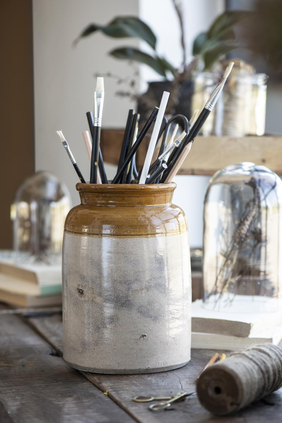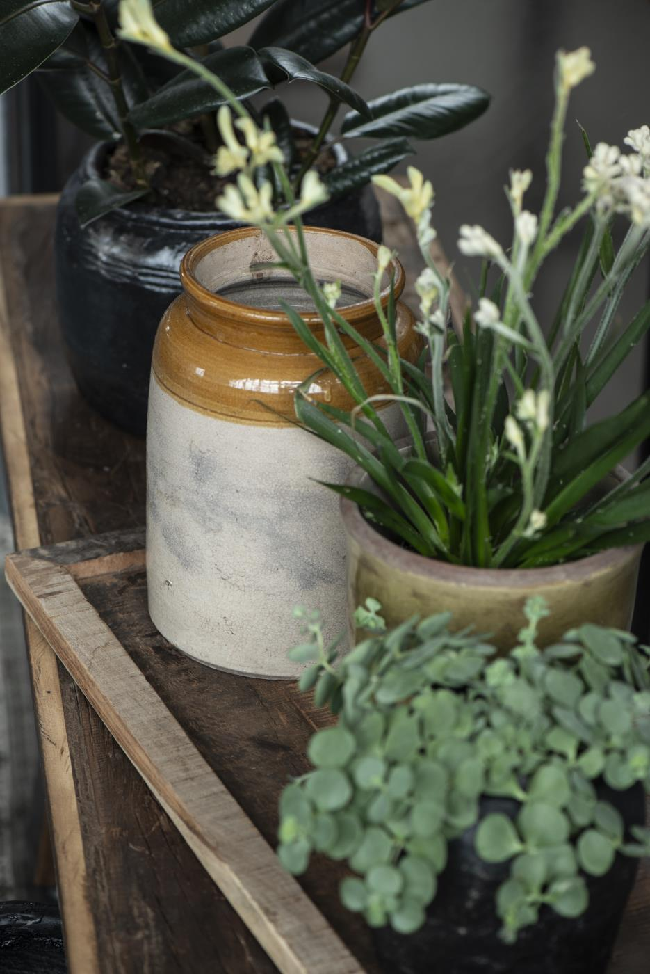 Unik rund keramikkrukke fra Ib Laursen, i creme og brun. Krukken kan bruges til opbevaring eller til en plante.