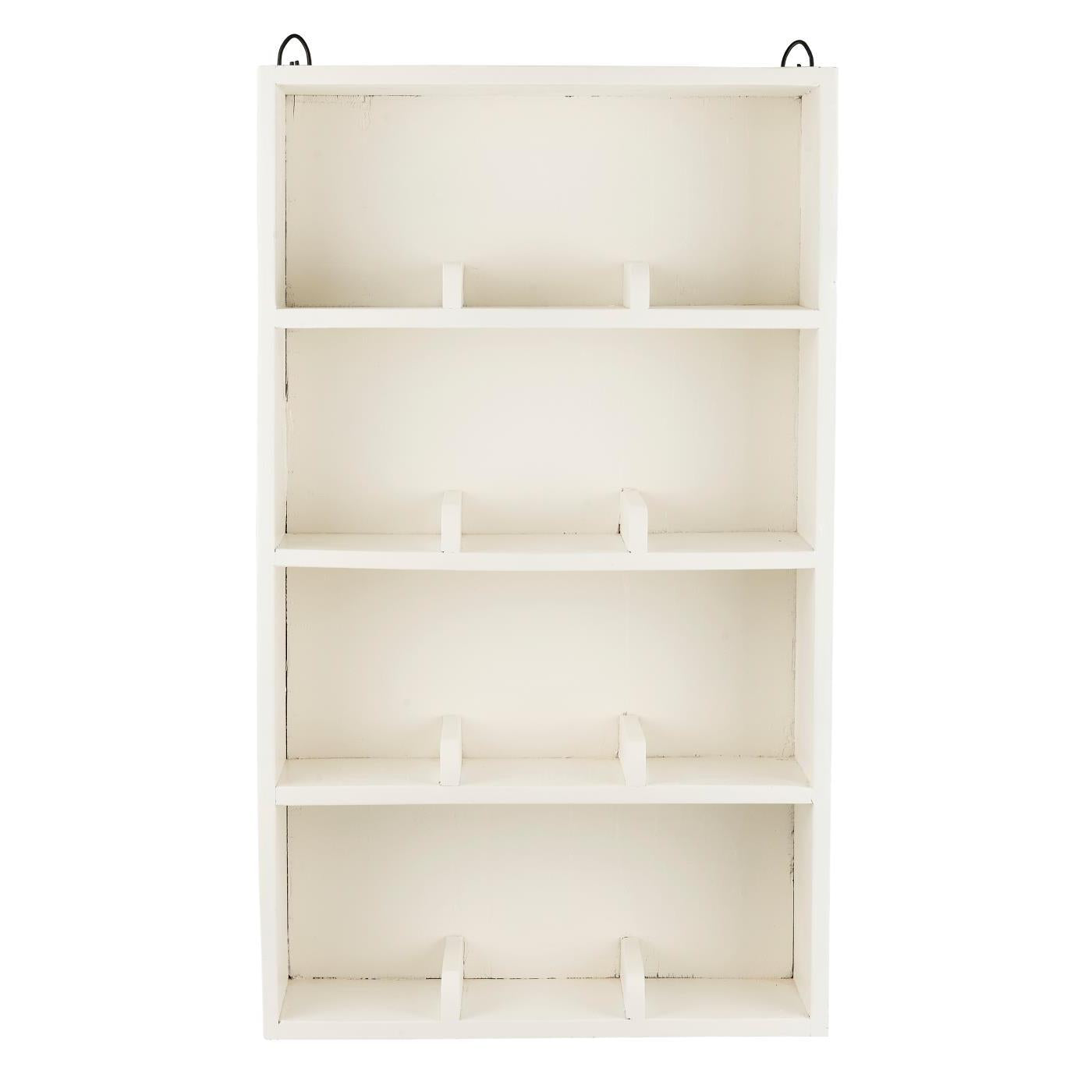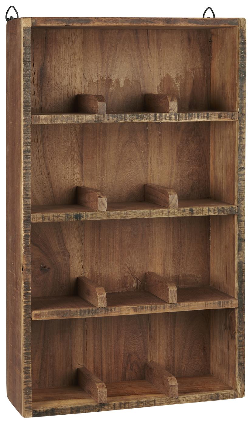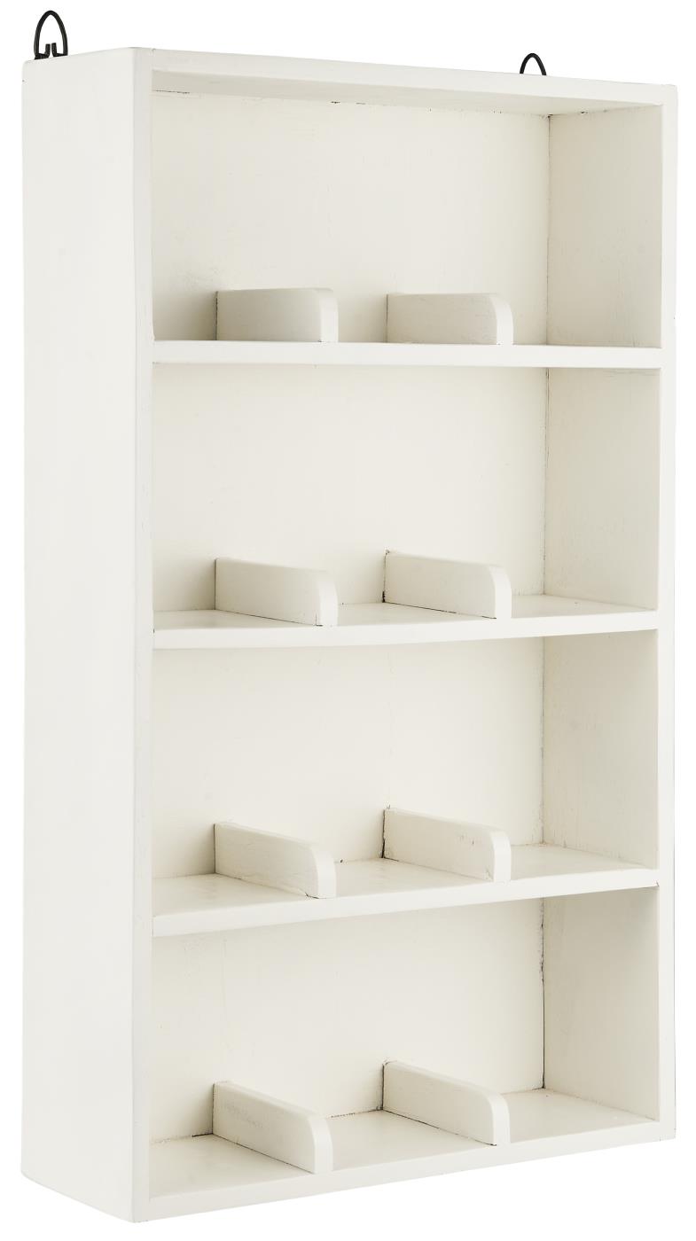 Hylde til at hænge op eller til at stille op af en væg. Hylden er i UNIKA træ og opdelt med 4 hylder der hver er opdelt i 3 rum, så der er 12 små rum. Findes i rå genbrugstræ, og i en hvid/creme med patina.