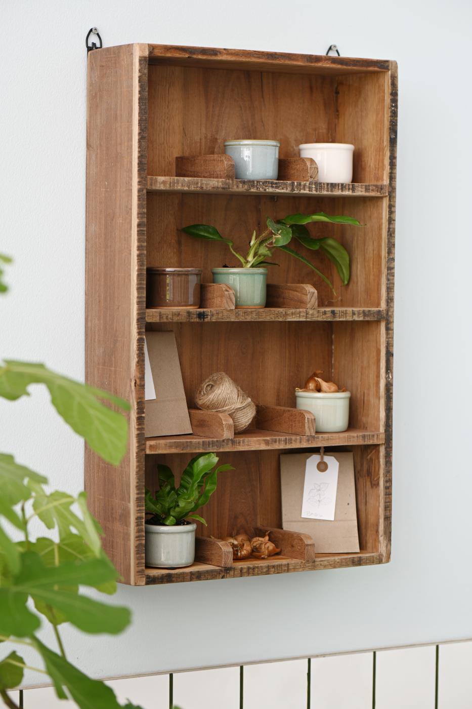 Træhylde til væggen til opbevaring af små krukker eller til dine kaffekrus. Hylden er lavet af genbrugstræ, hvilke gør at hylden er helt unik i i farve og overfalde, og der er ikke to der er helt ens. Der er kroge bag på hylde så den er nem at hænge op, eller den kan stå op af væggen, fyldt med dine unikke kaffekopper, eller andet pynt. Er du til en væghylde i rustik og vintage træ med små rum, er denne reol lige noget for dig.