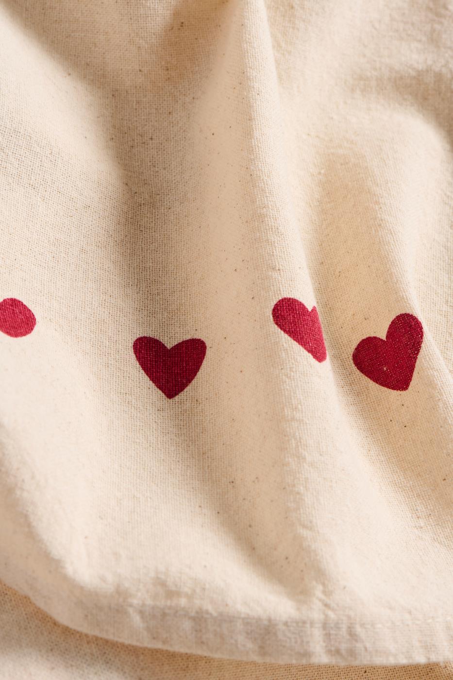 Viskestykke i natur farvet bomuld med røde julehjerter, og med strop til ophæng. Viskestykket er lavet af 100 % bomuld, og anbefales at blive vasket ved 40 grader.
